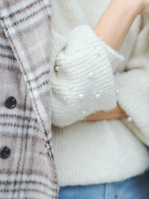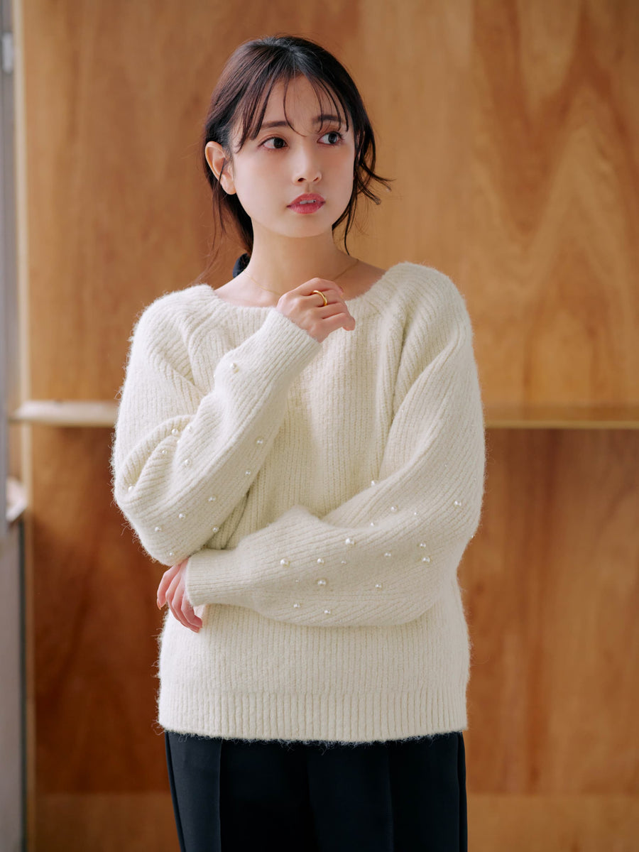 程良いフォルムの袖にパールを散りばめたトレンド感溢れるニットトップス。4種類の大きさのパールを組み合わせ、配置バランスにこだわったパールのグラデーションが贅沢な1枚です。ゆるっとしたボクシーなシルエットが女性らしく、大人見えするアイテム。スクエアネックのデザインで抜け感のある首元を演出してくれます。