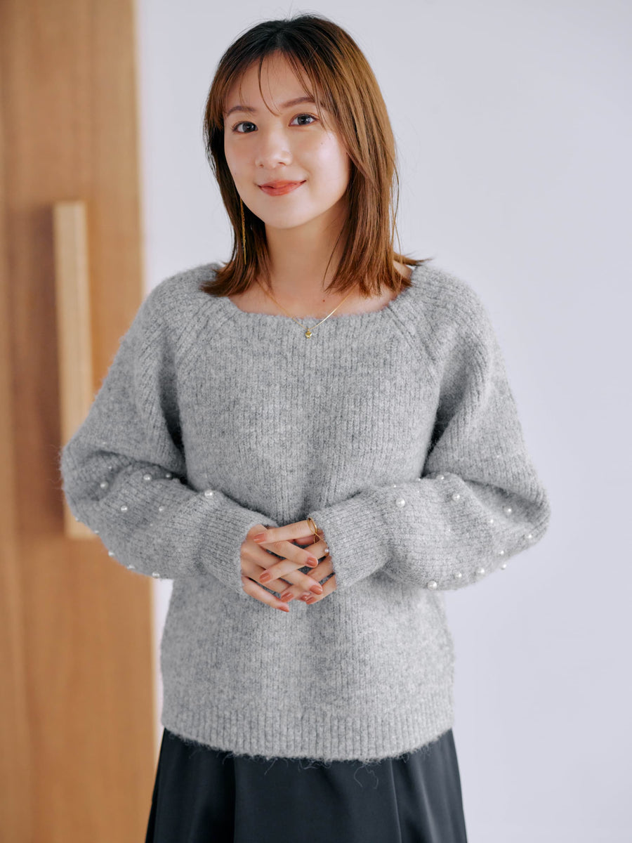 お袖のパールがフェミニンな印象のニット。大小様々な大きさのパールがとってもかわいいです♡厚手のニットですが首元が程よく空いているのですっきり見えも叶い、着ぶくれ感も軽減されてるのが嬉しい!