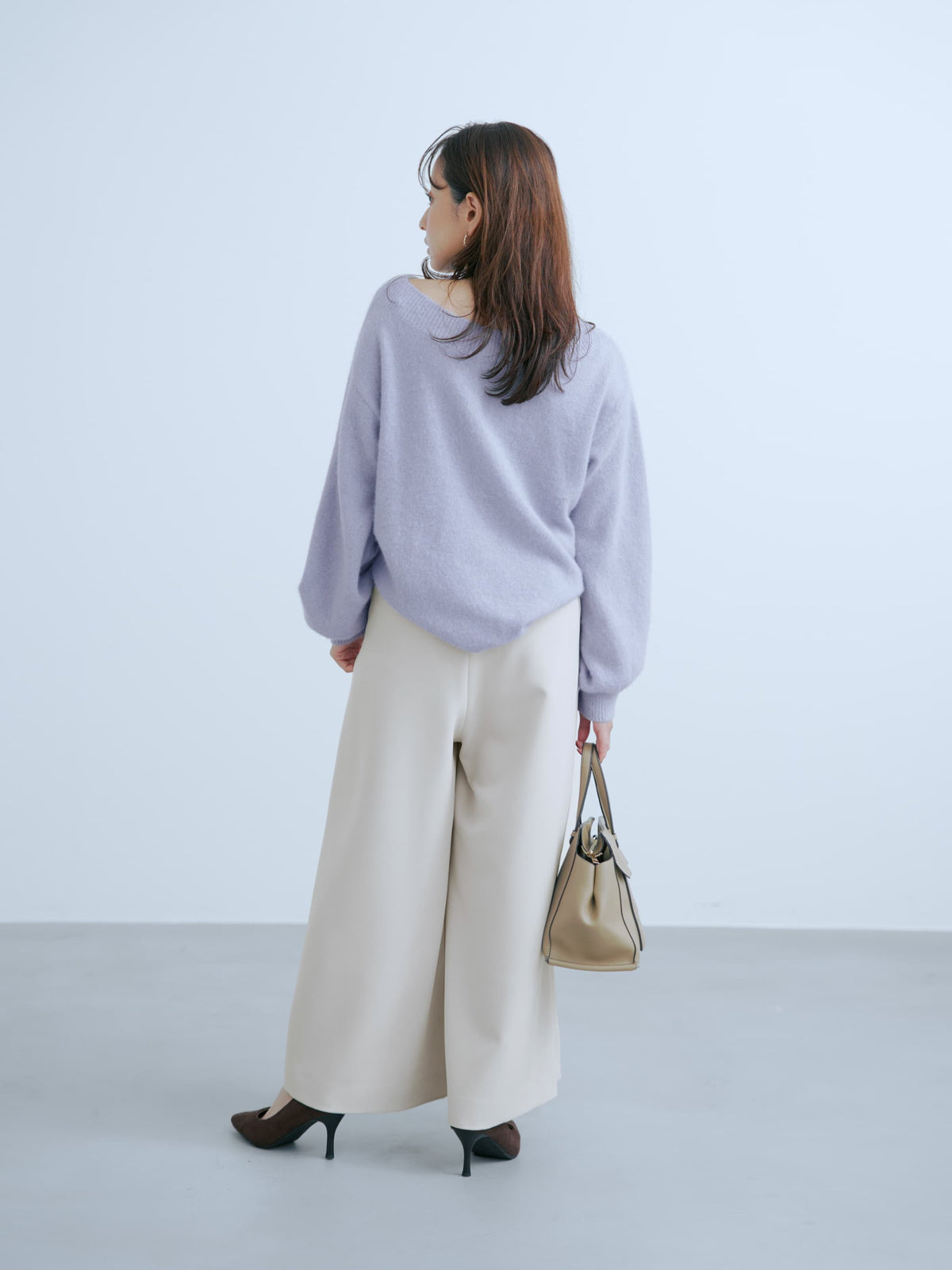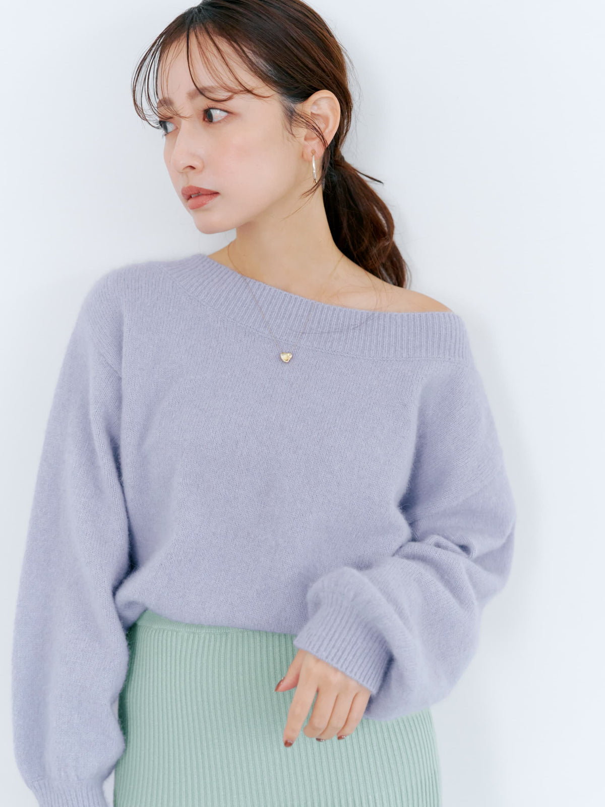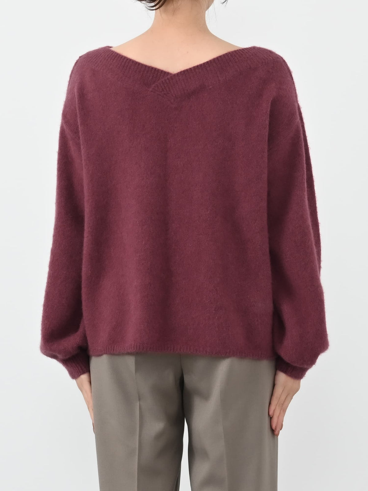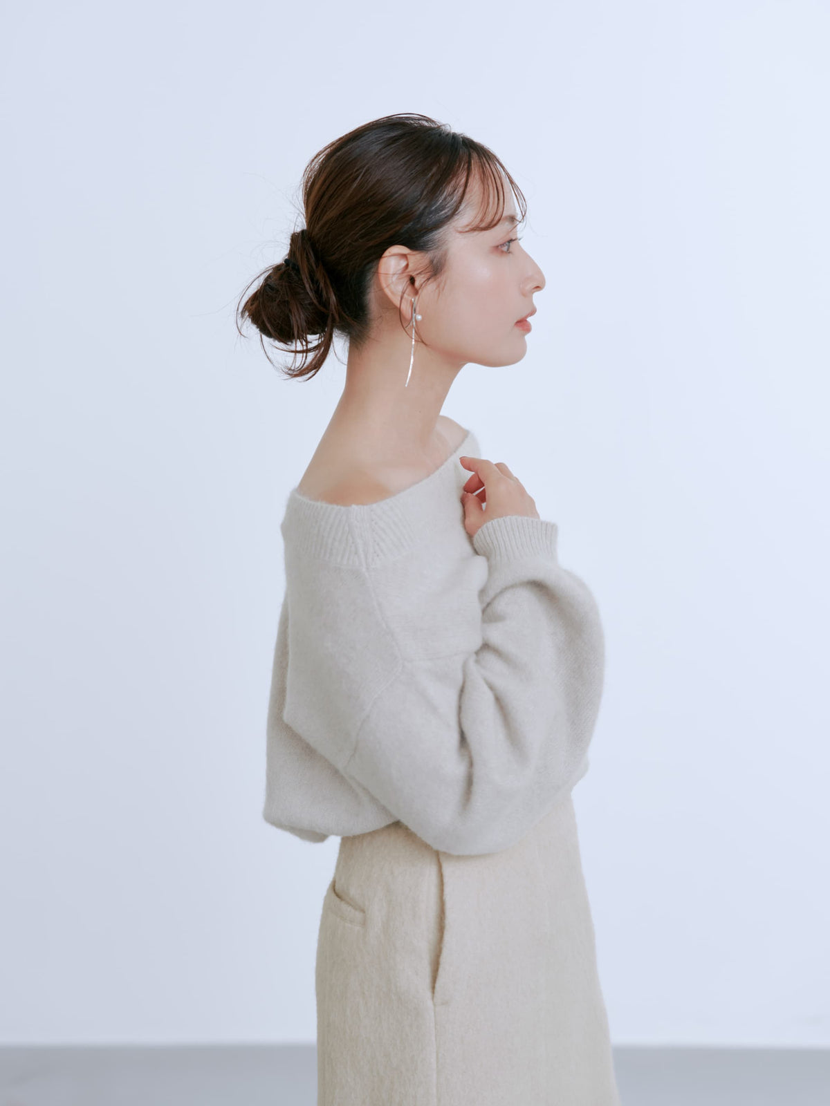 ふんわり柔らかなフォックスアンゴラ混の糸を使用した、上品な風合いの2wayネックニット。前後どちらでも着られるデザインで、気分やスタイリングに合わせてVネックとボートネックを楽しめます。
