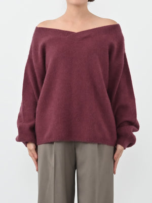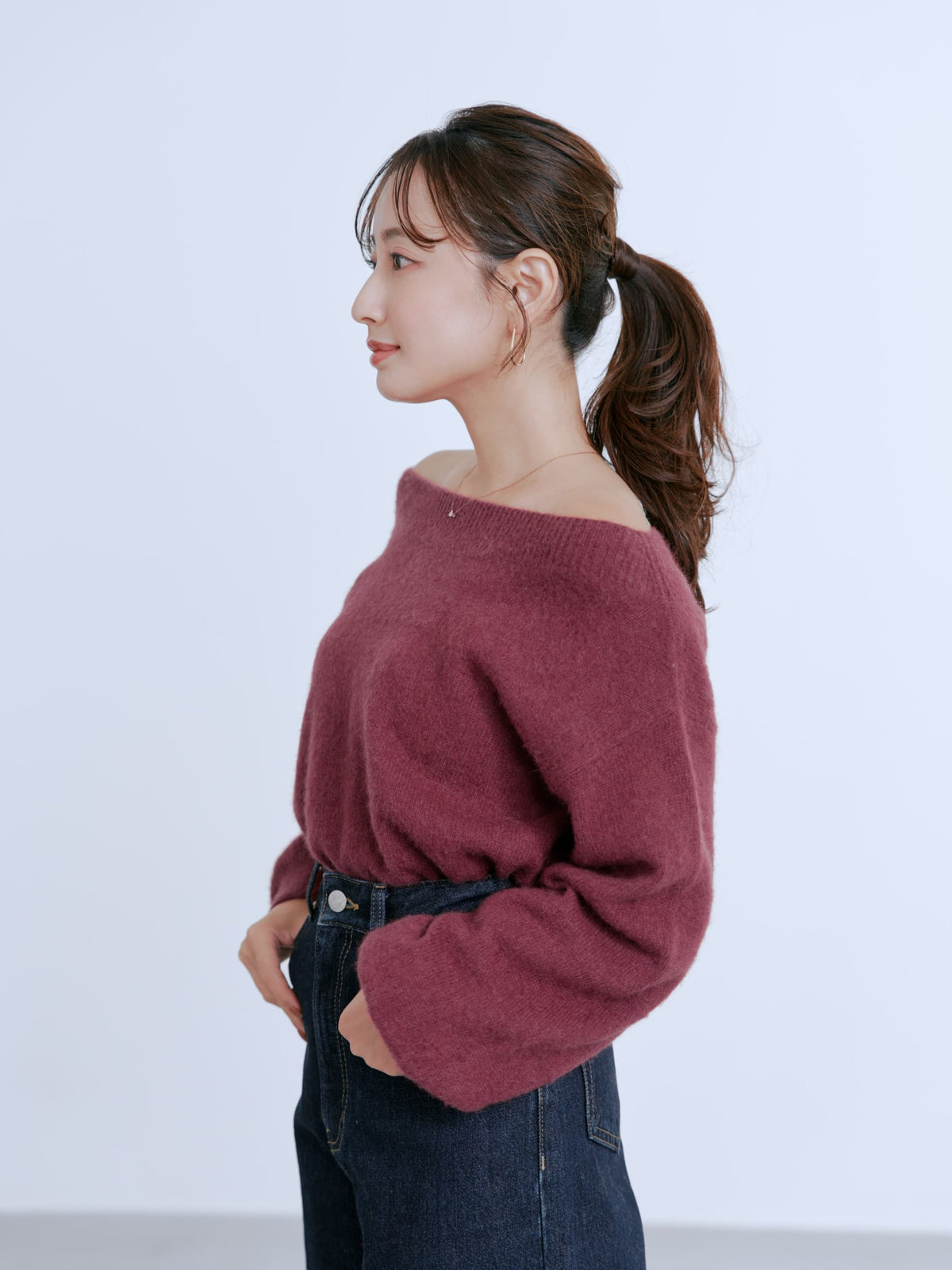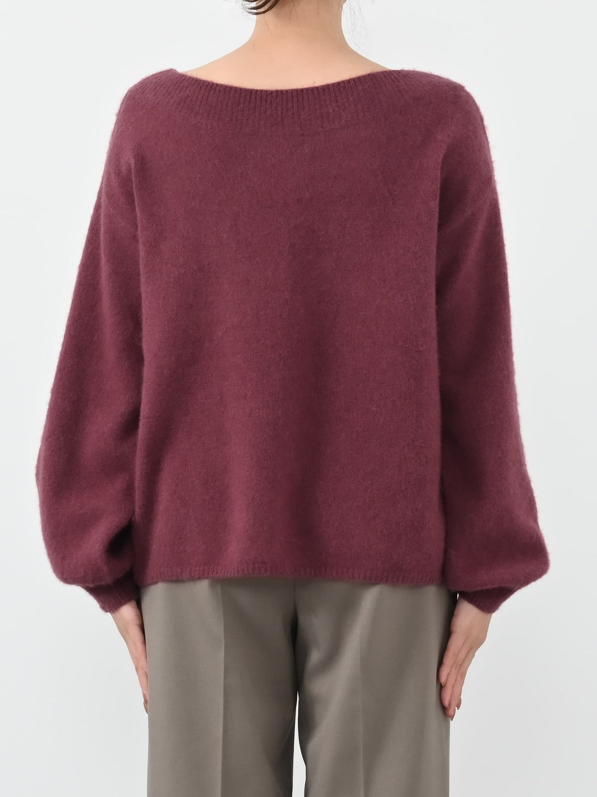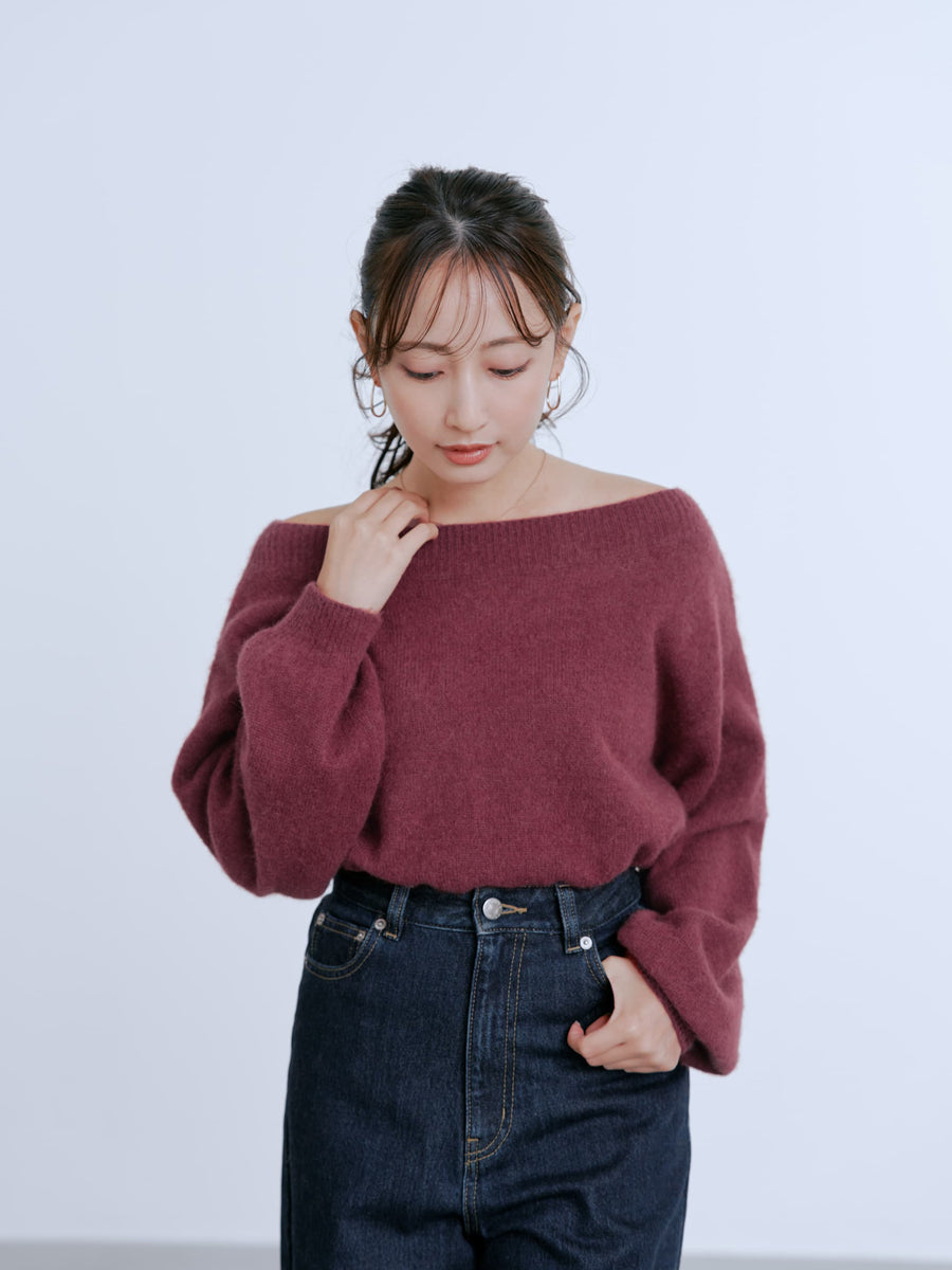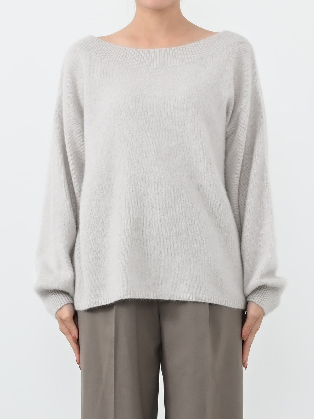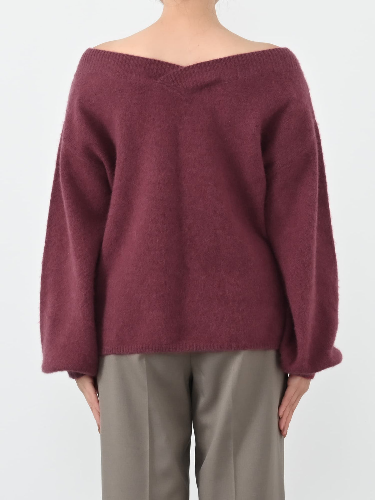 ふんわり柔らかなフォックスアンゴラ混の糸を使用した、上品な風合いの2wayネックニット。前後どちらでも着られるデザインで、気分やスタイリングに合わせてVネックとボートネックを楽しめます。