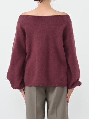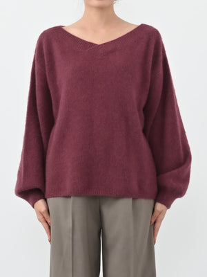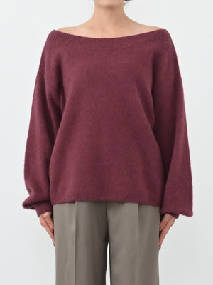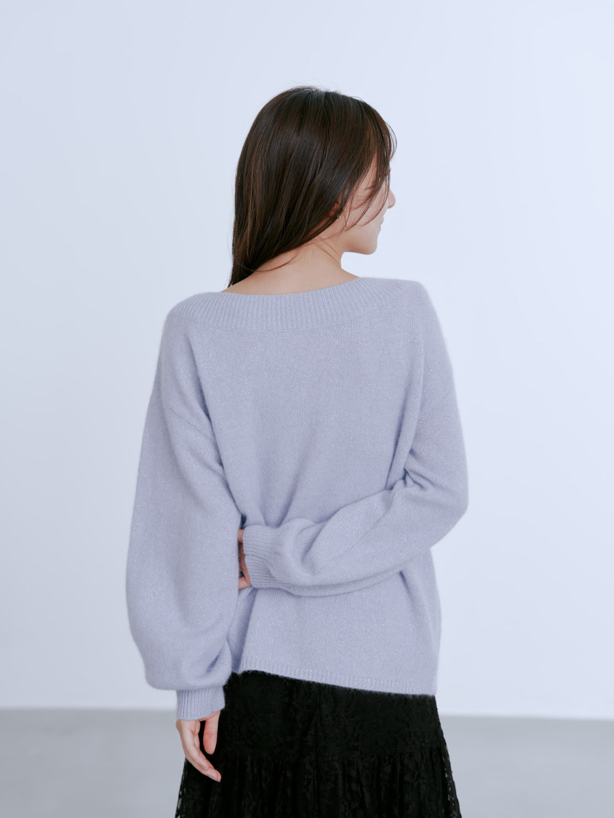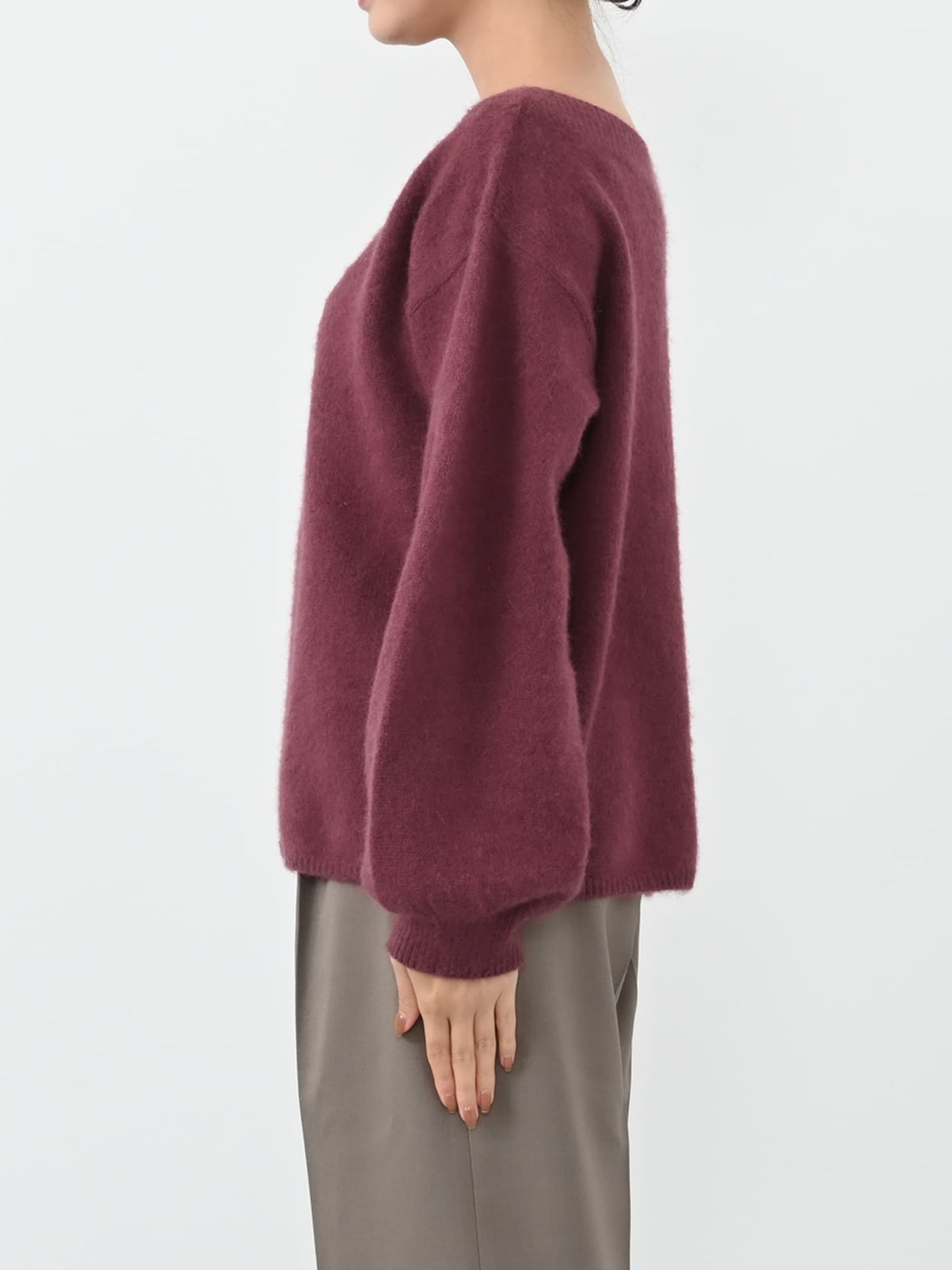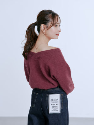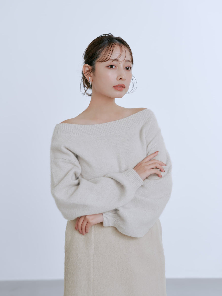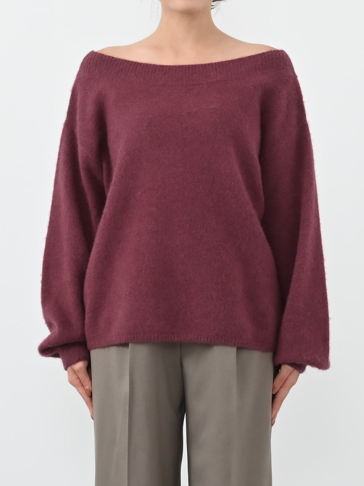 ふんわり柔らかなフォックスアンゴラ混の糸を使用した、上品な風合いの2wayネックニット。前後どちらでも着られるデザインで、気分やスタイリングに合わせてVネックとボートネックを楽しめます。