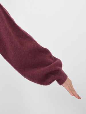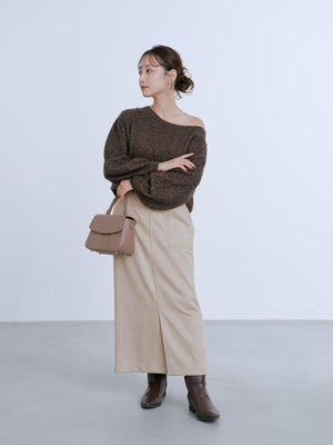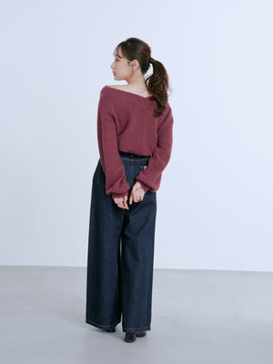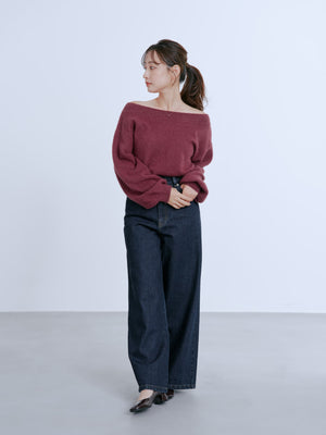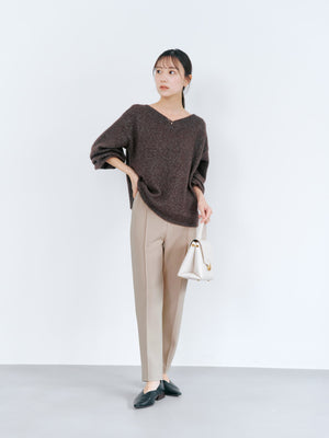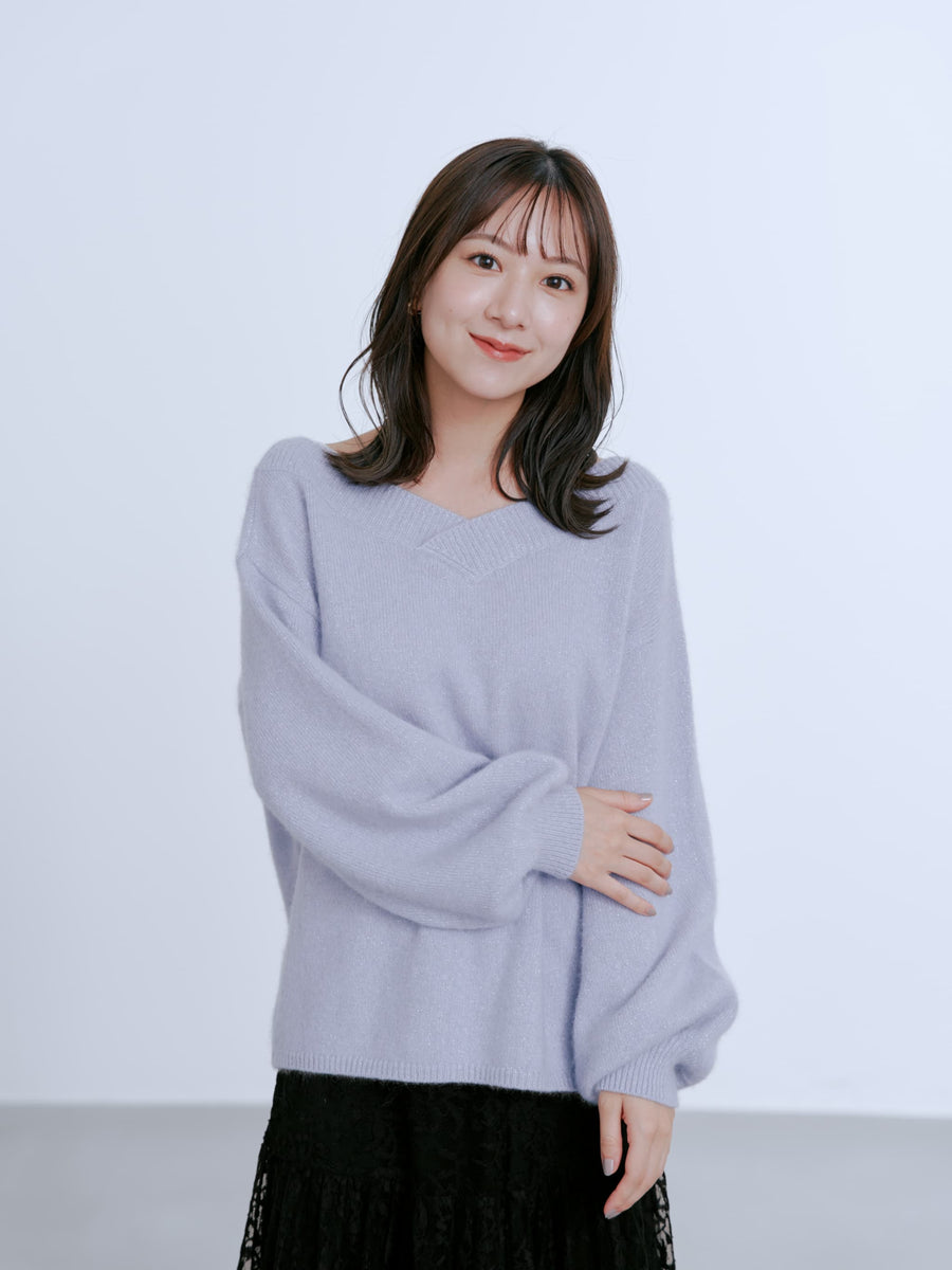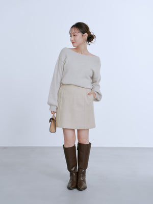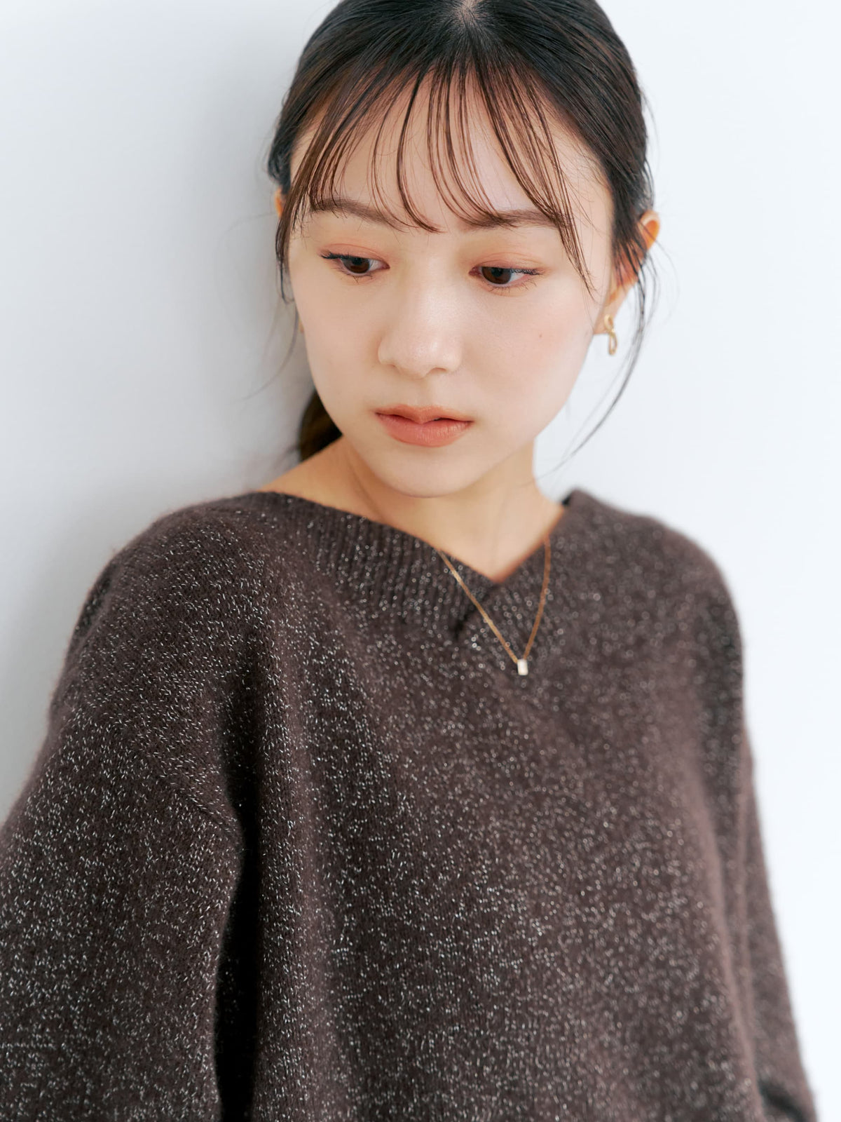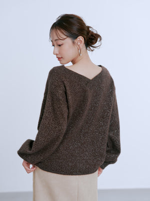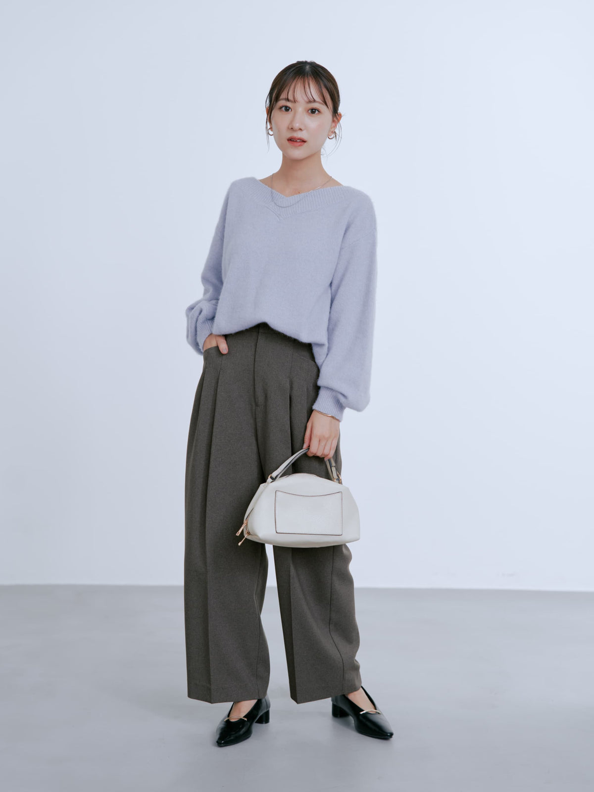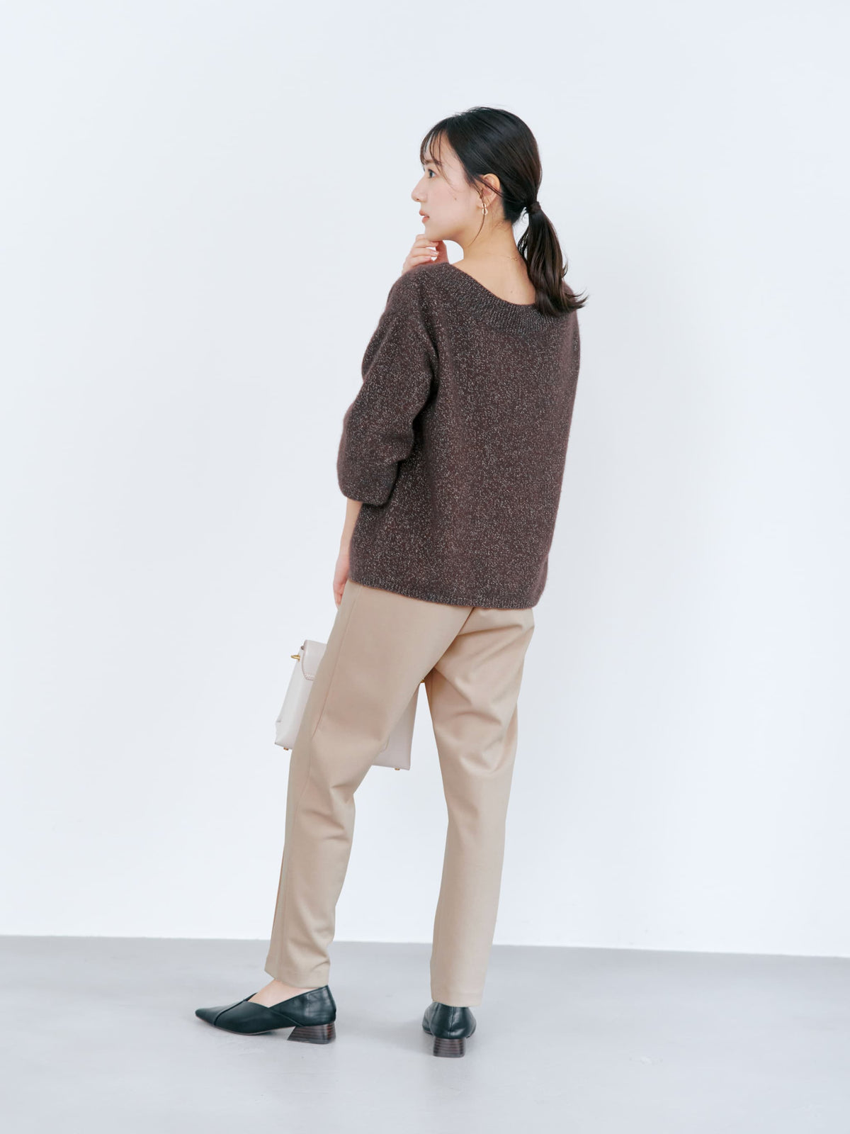 ふんわり柔らかなフォックスアンゴラ混の糸を使用した、上品な風合いの2wayネックニット。前後どちらでも着られるデザインで、気分やスタイリングに合わせてVネックとボートネックを楽しめます。