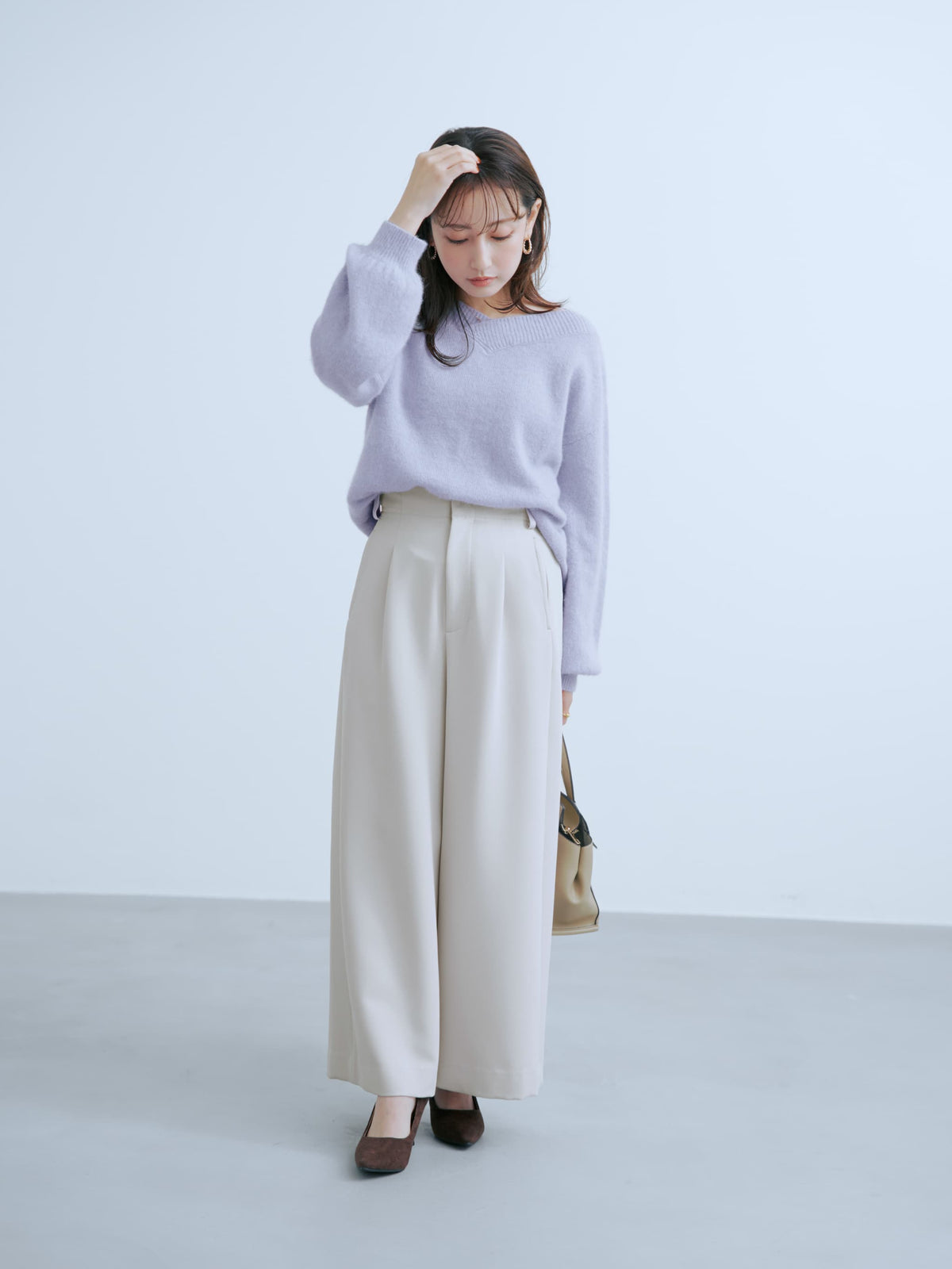 デニムと合わせれば抜け感のあるカジュアルコーデでこなれ感もUP。インナーにタートルを仕込んで、ニットはボートネックで着ればトレンドライクなレイヤードスタイルに。ワントーンのニュアンスコーデもおすすめです。