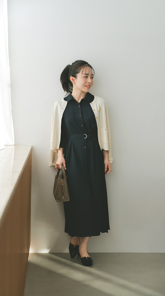 卒入園式や式典など、ハレの日に迷わず選べる心強い王道ワンピース。やさしく華やぐデザインと、そっと体に沿うぴったりサイズ設計で、上品さと安心感を両立。ワントーンでまとめることで、上品さとやわらかな女性らしさが漂います。COHINAの定番トレンチコートとの相性もバッチリです。