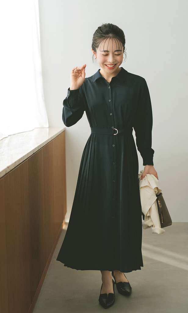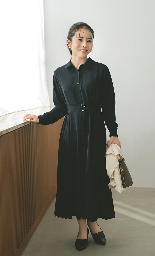きちんと感と女性らしさを兼ね備えた、ネイビーのプリーツワンピース。動くたびにふわりと揺れる軽やかなシルエットが、上品でやさしい印象を演出します。さりげなく光るウエストベルトでスタイルアップも叶えながら、卒入園式から式典、お食事会まで幅広いシーンに寄り添う一枚です。