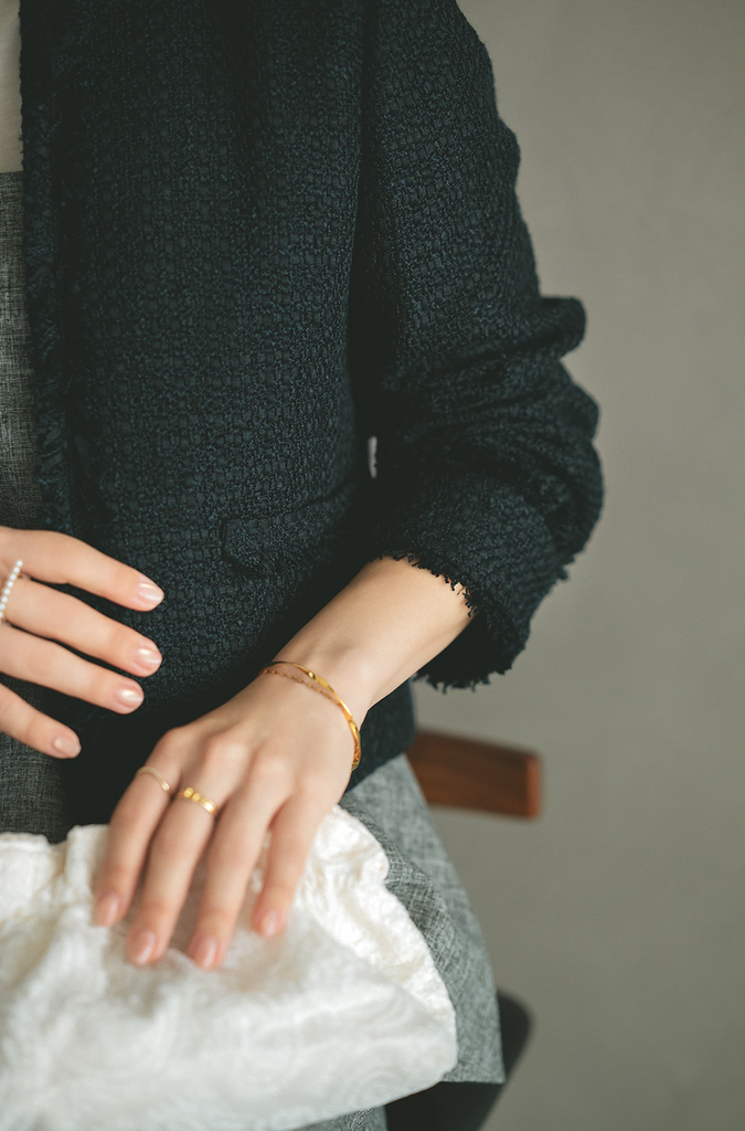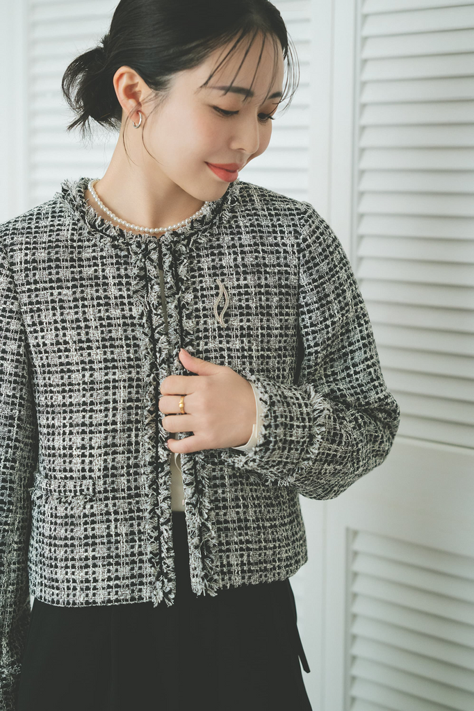 ブラックベースのミックスツイードは、単色ながら素材の表情が際立ち、モノトーンスタイルを立体的に仕上げます。糸そのものが持つほのかな光沢感がセレモニーシーンにぴったりな華やかさを添えてくれます。コンパクトな丈感でオールインワンとも好相性。重心が上がり、バランスよくまとめてくれます。