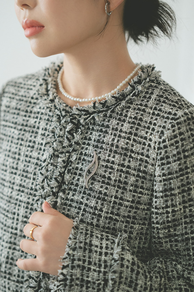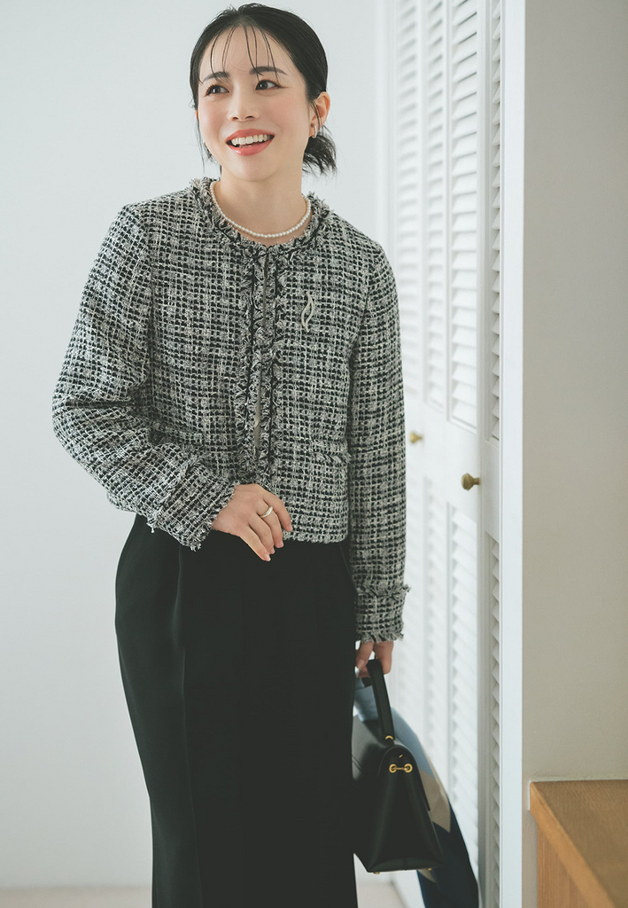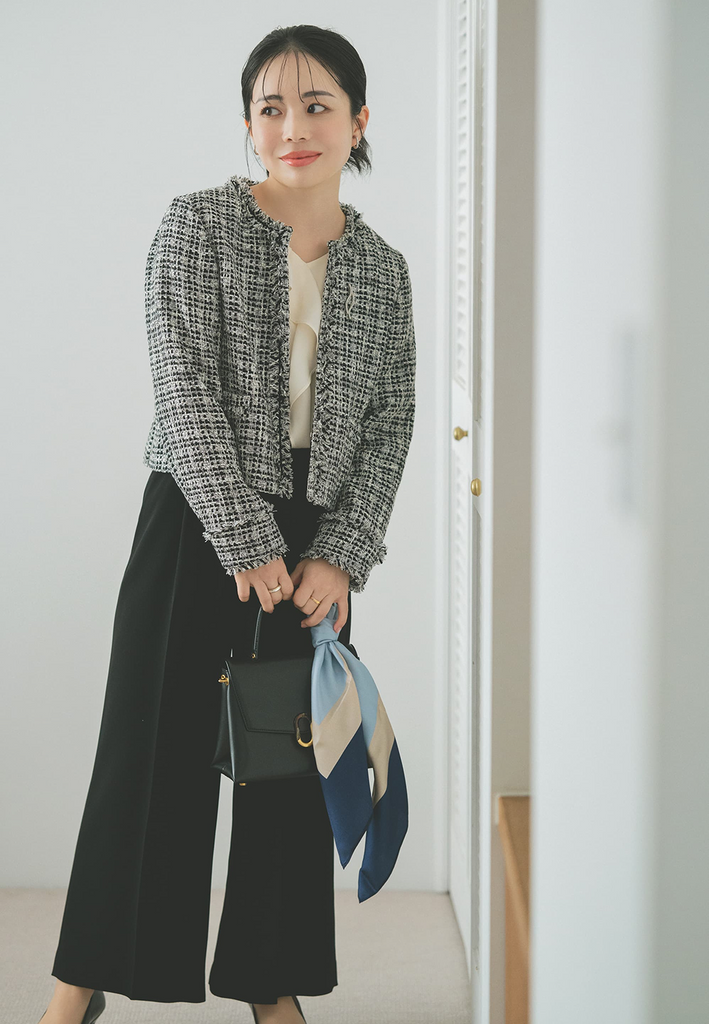 凛とした印象を纏いたい日に選ぶ、モノトーンのツイードスタイル。ミックスツイードの程よい存在感と、端正なシルエットのパンツ合わせが、セレモニーシーンにふさわしい品格を演出します。色味を抑えた装いながら華やかさもあり、大人らしい自信を感じさせるスタイルに。