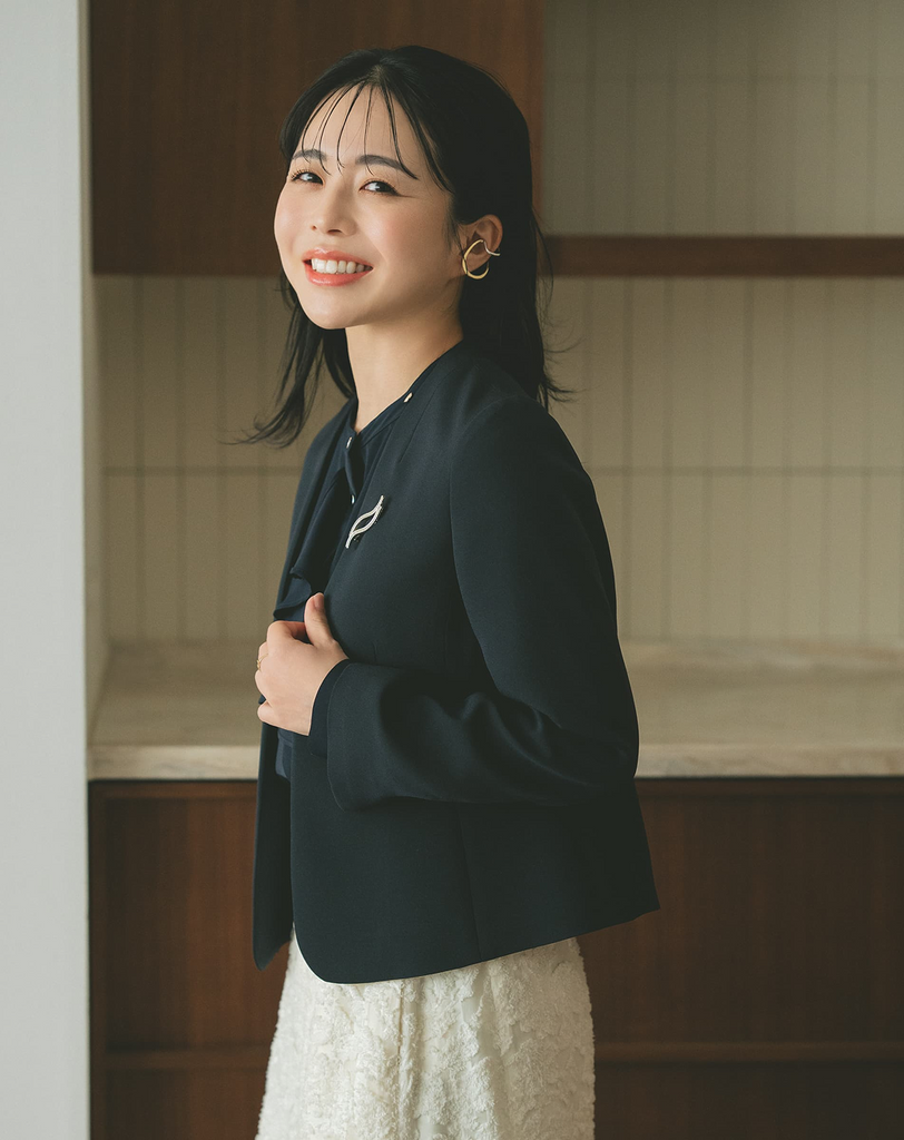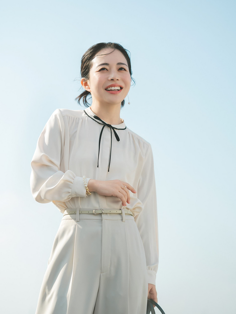 顔まわりに自然な華やぎを添える、リボンブラウスが主役のスタイル。甘さを抑えた大人のリボンと、爽やかなワントーンのパンツ合わせが、式典シーンに清潔感と好印象をプラスします。ジャケットやカーディガンから覗くリボンが、セレモニーの装いに女性らしさを添えてくれます。