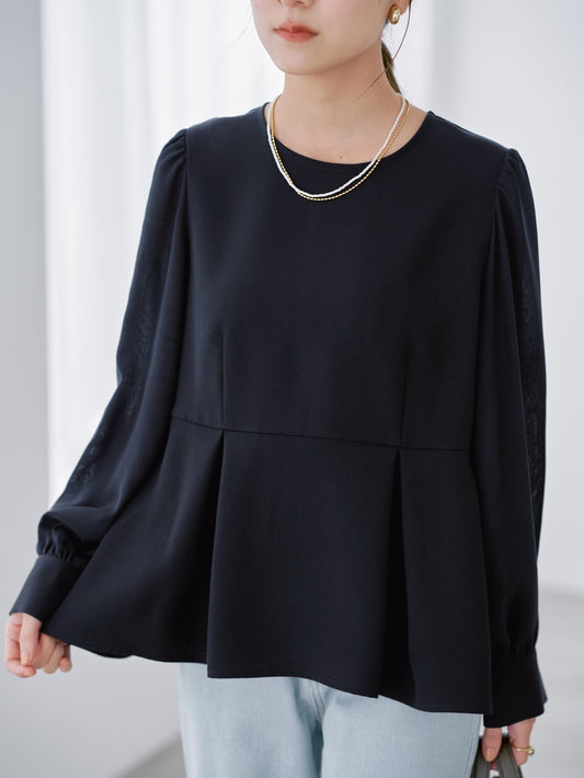 高め位置の切り替えが印象的なペプラムブラウスは、自然にスタイルアップを叶える設計。シフォンを重ねた袖は透け感を抑え、一枚でもフォーマルシーンに対応します。袖口のカフスに配したパールボタンが、さりげない華やぎを添えます。