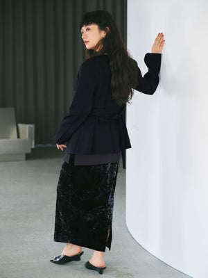 Iラインのベロアワンピースをセットで着用することで、こなれ感のあるスタイリングが完成する一押しアイテムです。