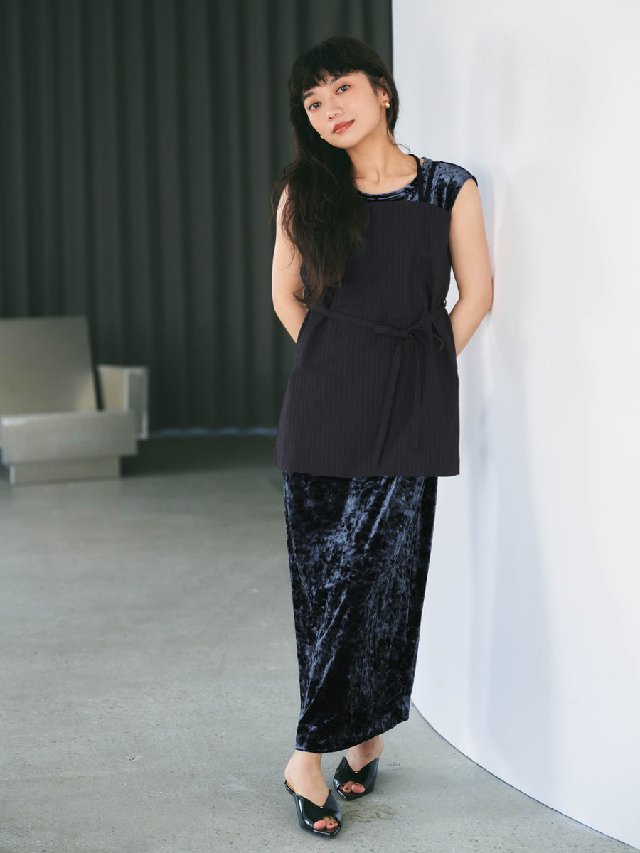ミニワンピースのようなバランスで着用いただける、やや着丈が長めなキャミソールとイージーな着心地のクラッシュベロアを使用したワンピースをセットにしました。