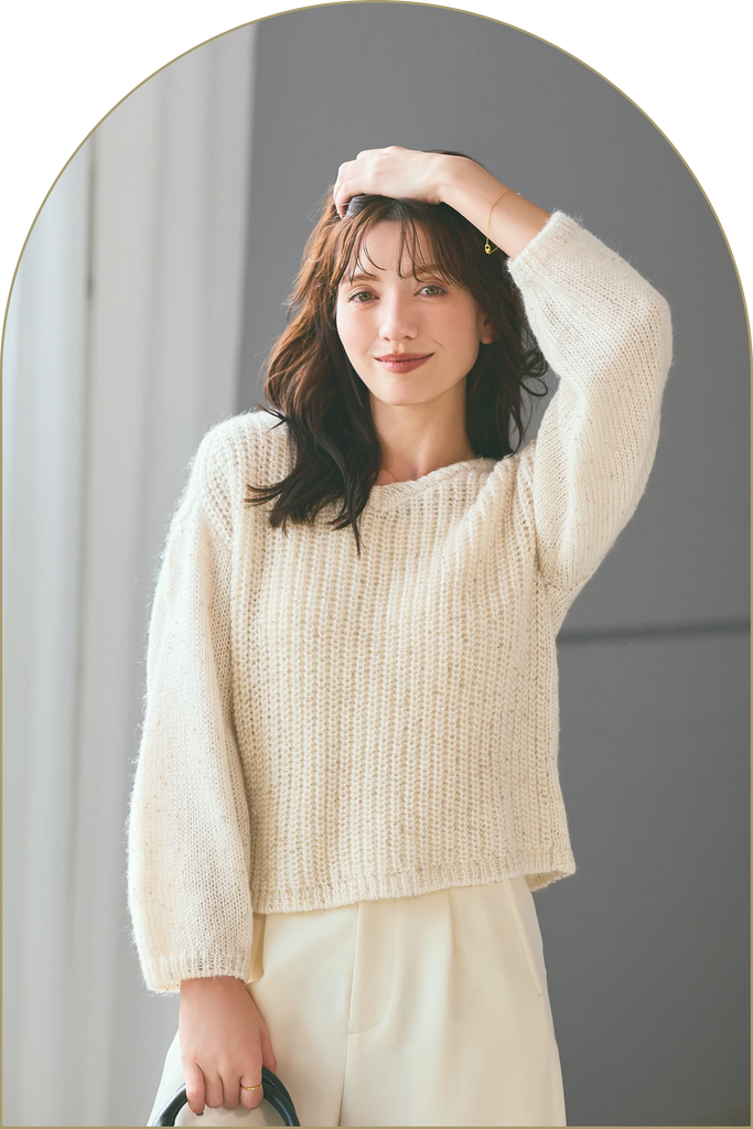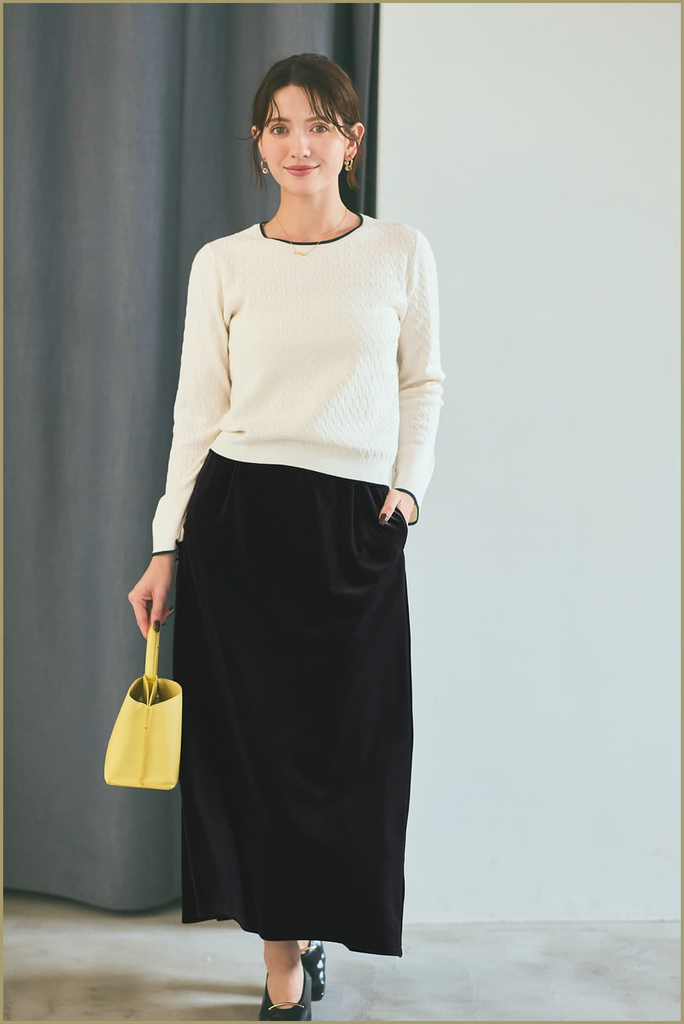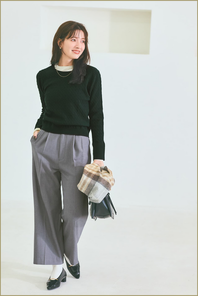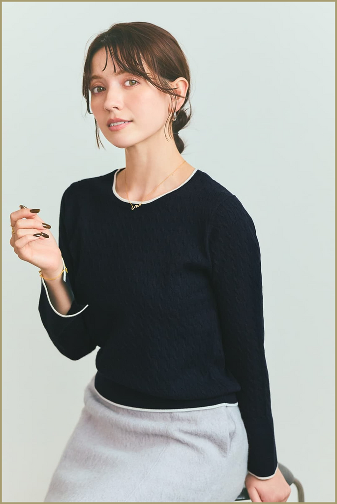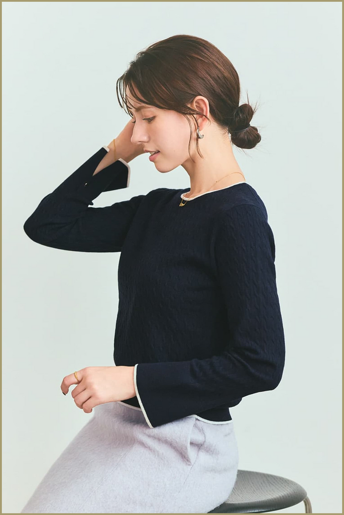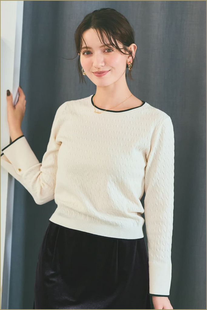 さりげなく華やぐバイカラーのケーブルリブニットは