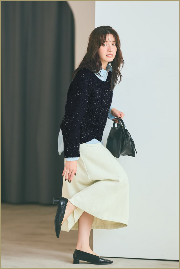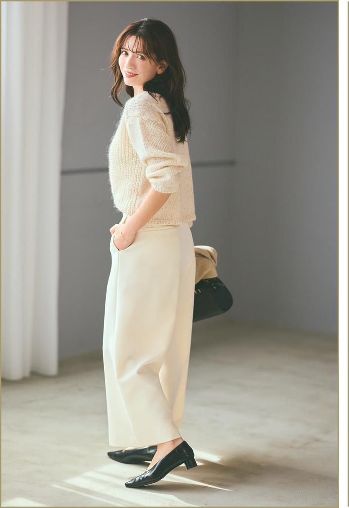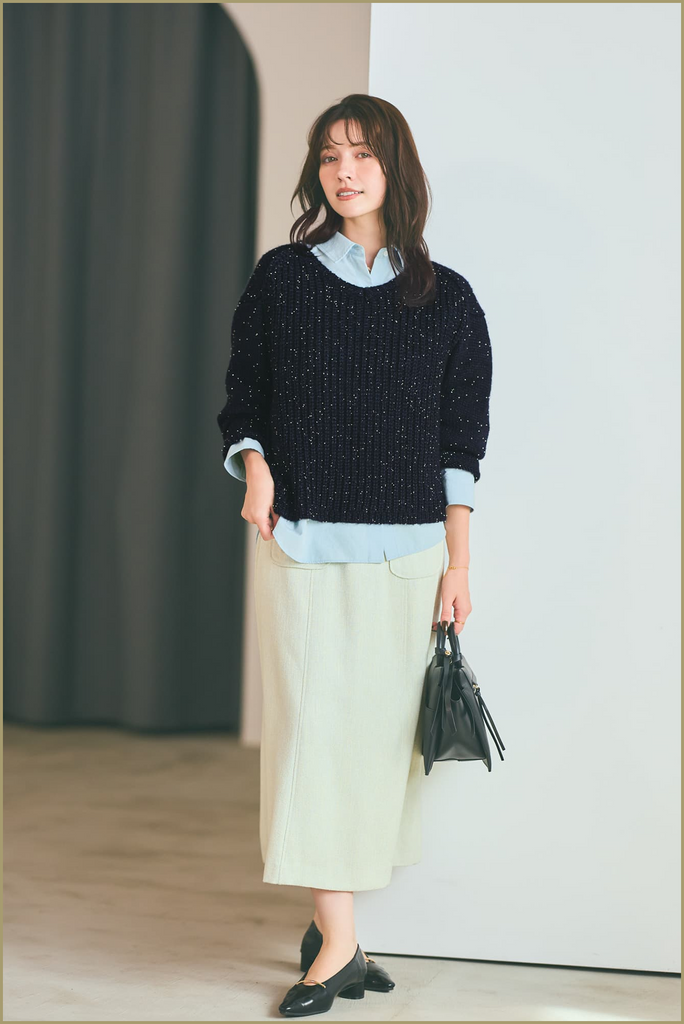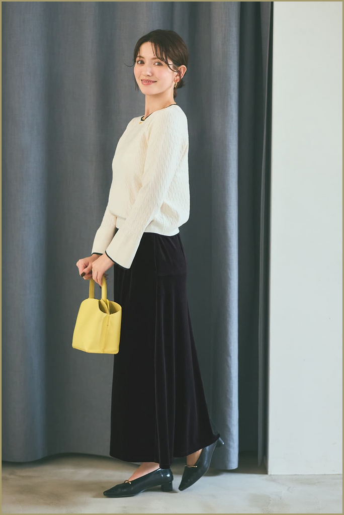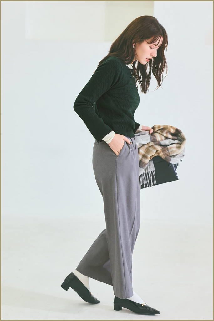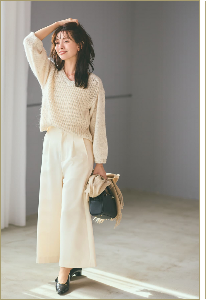 さりげなく華やぐバイカラーのケーブルリブニットは