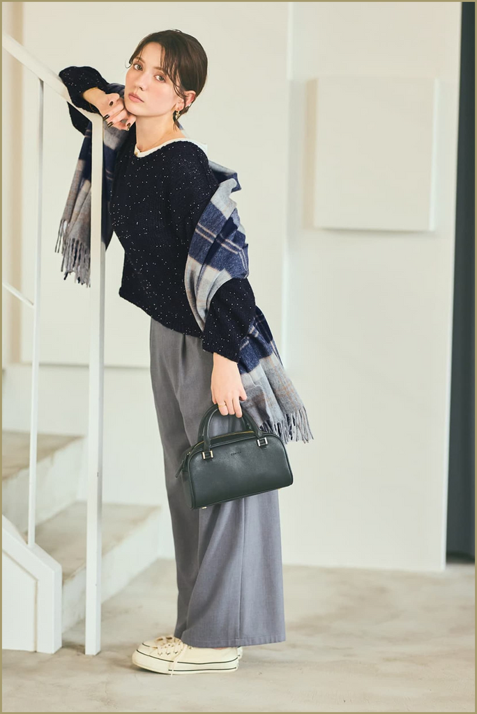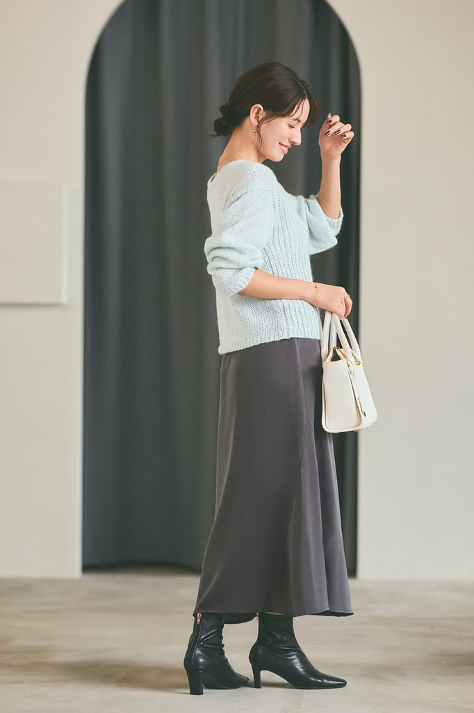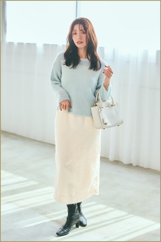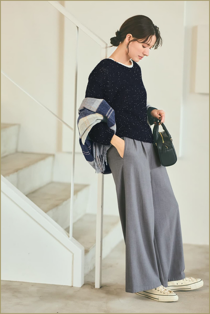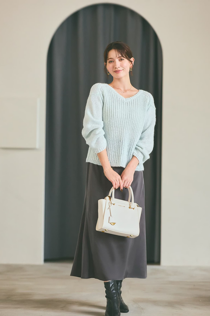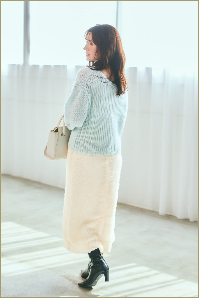 さりげなく華やぐバイカラーのケーブルリブニットは