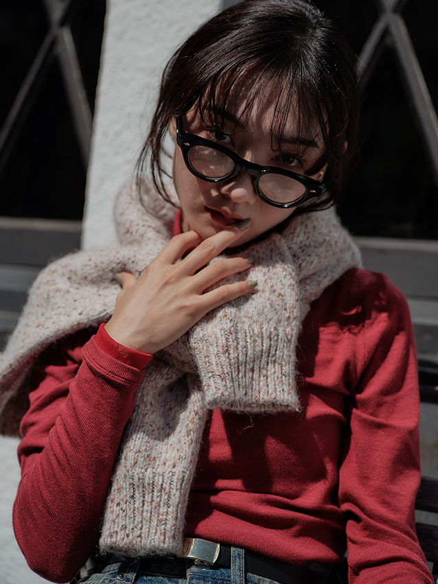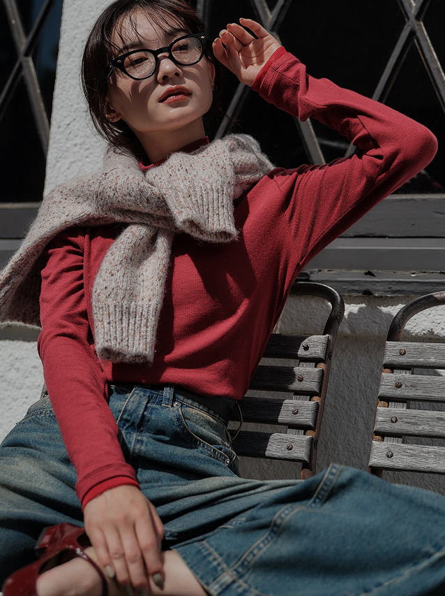 冬の街に灯る光のようなレッドのニットが、