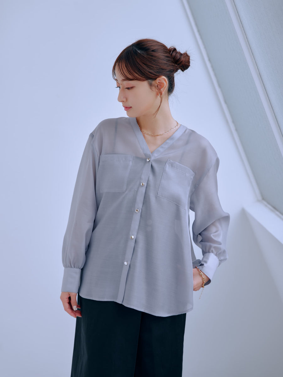 【ほんのり輝くシアー素材が魅力♡コーデを上品に仕上げるダブルポケットシアーシャツ】