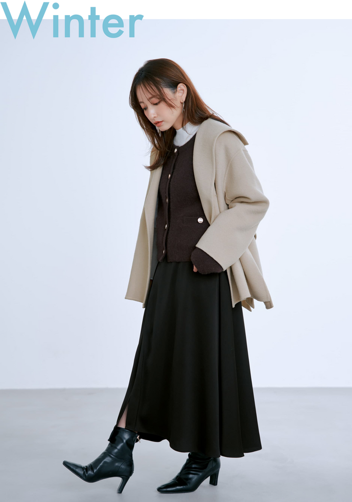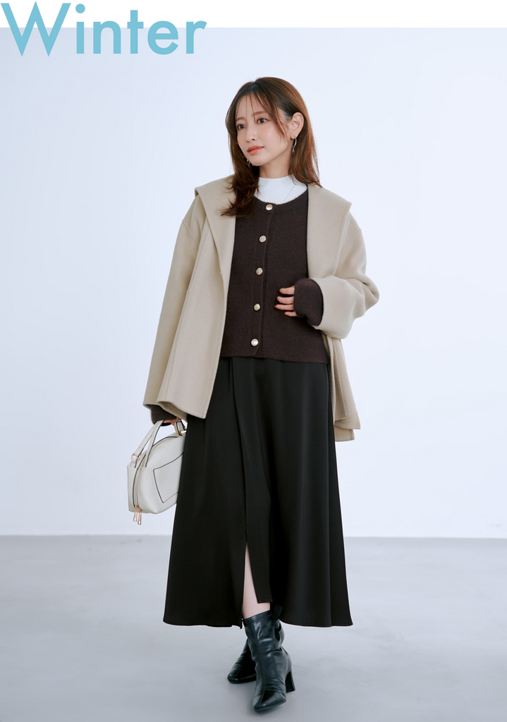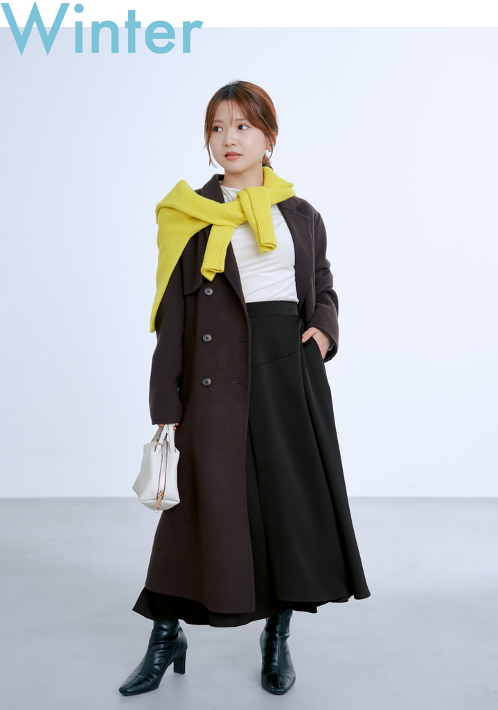 ロングコートからフレアなスカートを覗かせて、歩くたびに気分が上がる冬の定番コーデへ。目を引くカラーニットを肩に巻くだけでおしゃれ度UP!