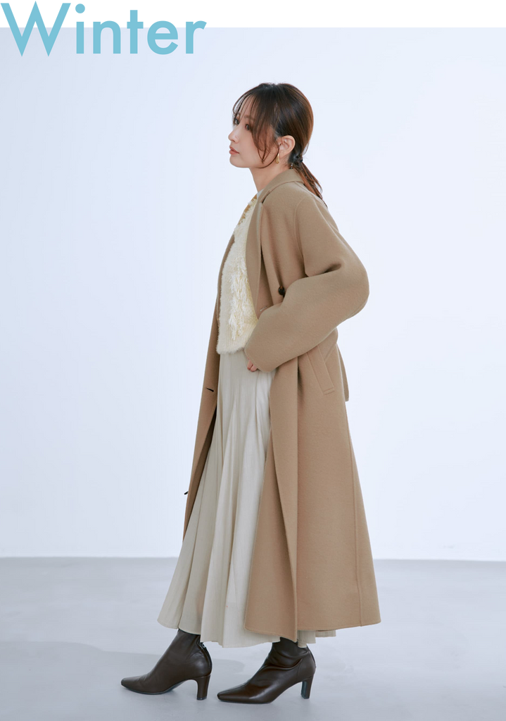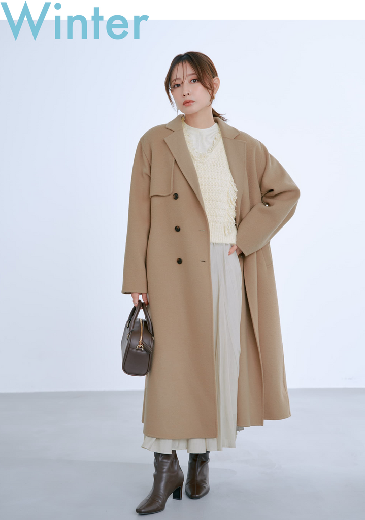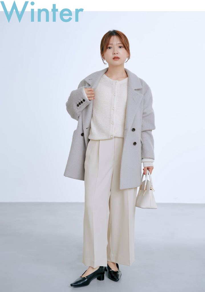 柔らかい冬らしいトーンで合わせた大人コーデ。ダブルコートの丈感はセンタープレスが入った美脚パンツとの相性抜群◎デイリーだけでなくオフィスシーンにも対応できます♪