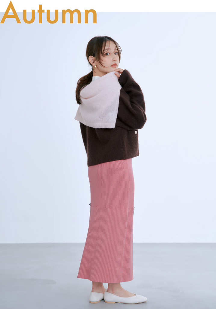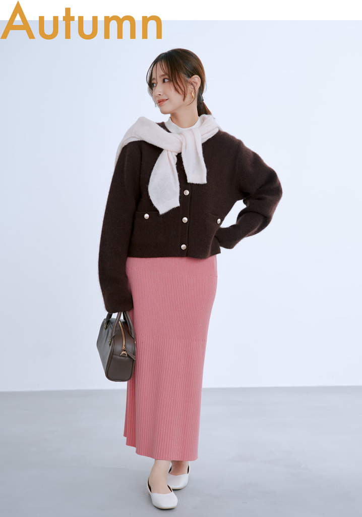 ボタンを全て止めてプルオーバー風に着たニットジャケットにIラインスカートを合わせてバランスよく◎甘めなピンクスカートも落ち着いたブラウンカラーを合わせることで大人っぽく仕上げて。