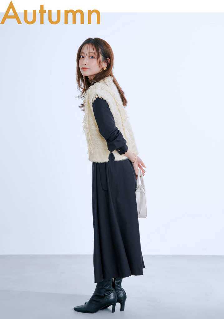 ワンピースと合わせて秋ならではのレイヤードコーデが完成♪ベストはコンパクトな丈感なので全体のバランス感もバッチリ◎フリンジやラメがコーデの良いアクセントに。