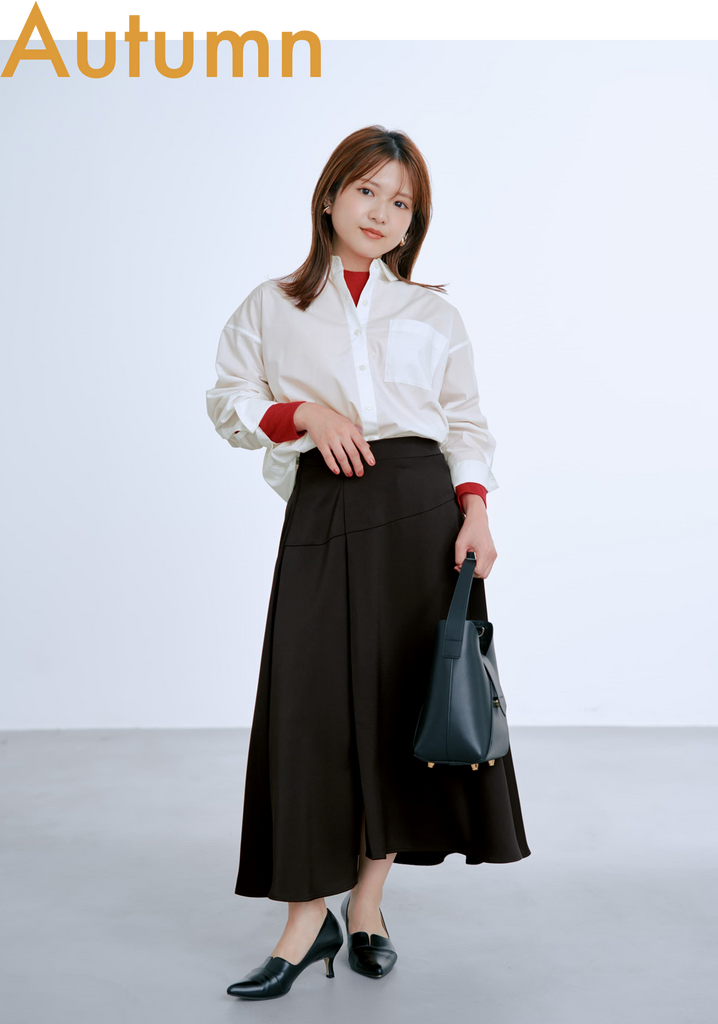 フレアなスカートにシャツを合わせてきれいめな印象に。レッドのハイネックニットをレイヤードして個性を出すことでシンプルなコーデを華やかに◎