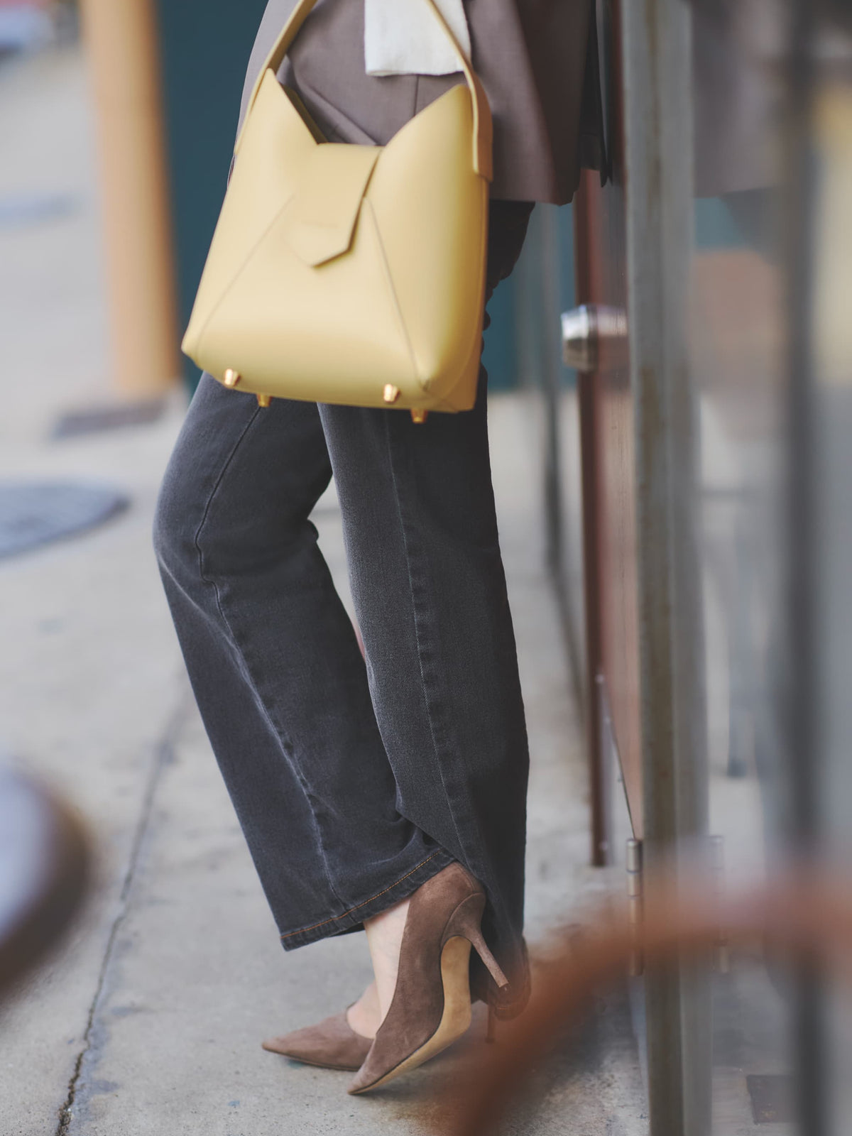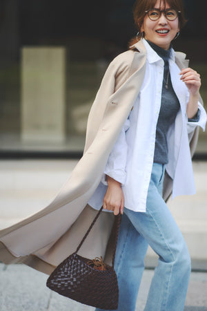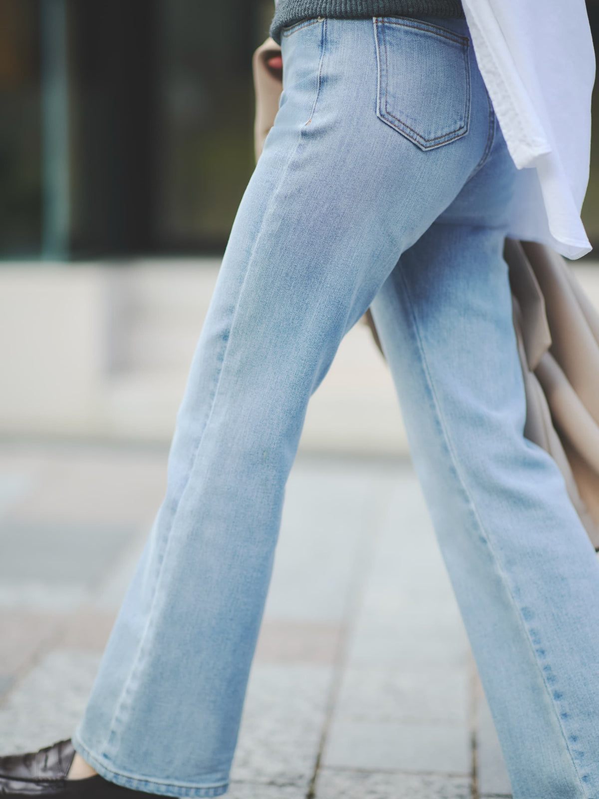 COHINA DENIMの中でも美脚効果抜群!とご好評いただいているブーツカット。 膝下が長くスタイルアップして見える筒のシルエットはキープしつつ、主に股ぐりやもも周りの設計を見直し、より自然に身体に馴染みすっきりと美しく履いていただけるようパターンを見直しました。 また、後ろのポケット位置をほんの少し上げ、ヒップが綺麗に上向きに見えるようにアップデートしました。