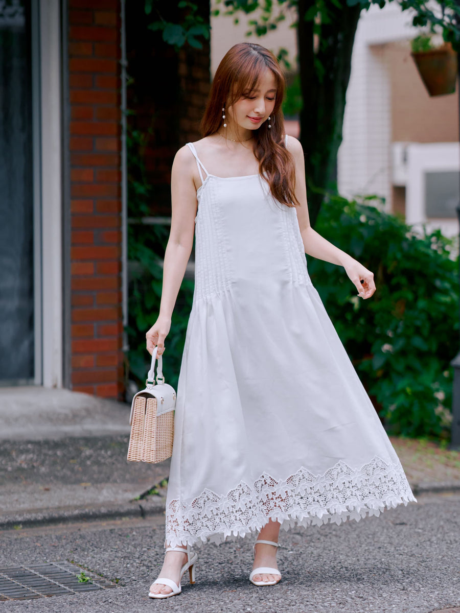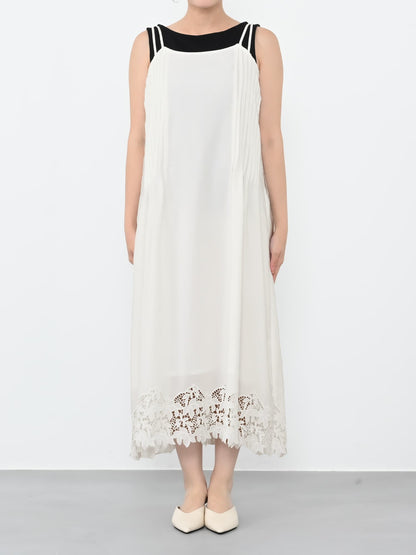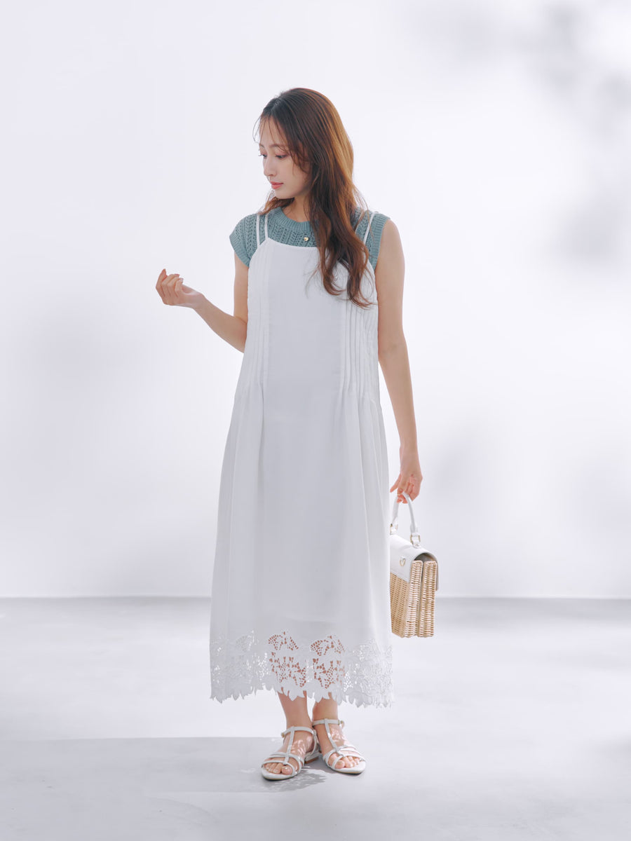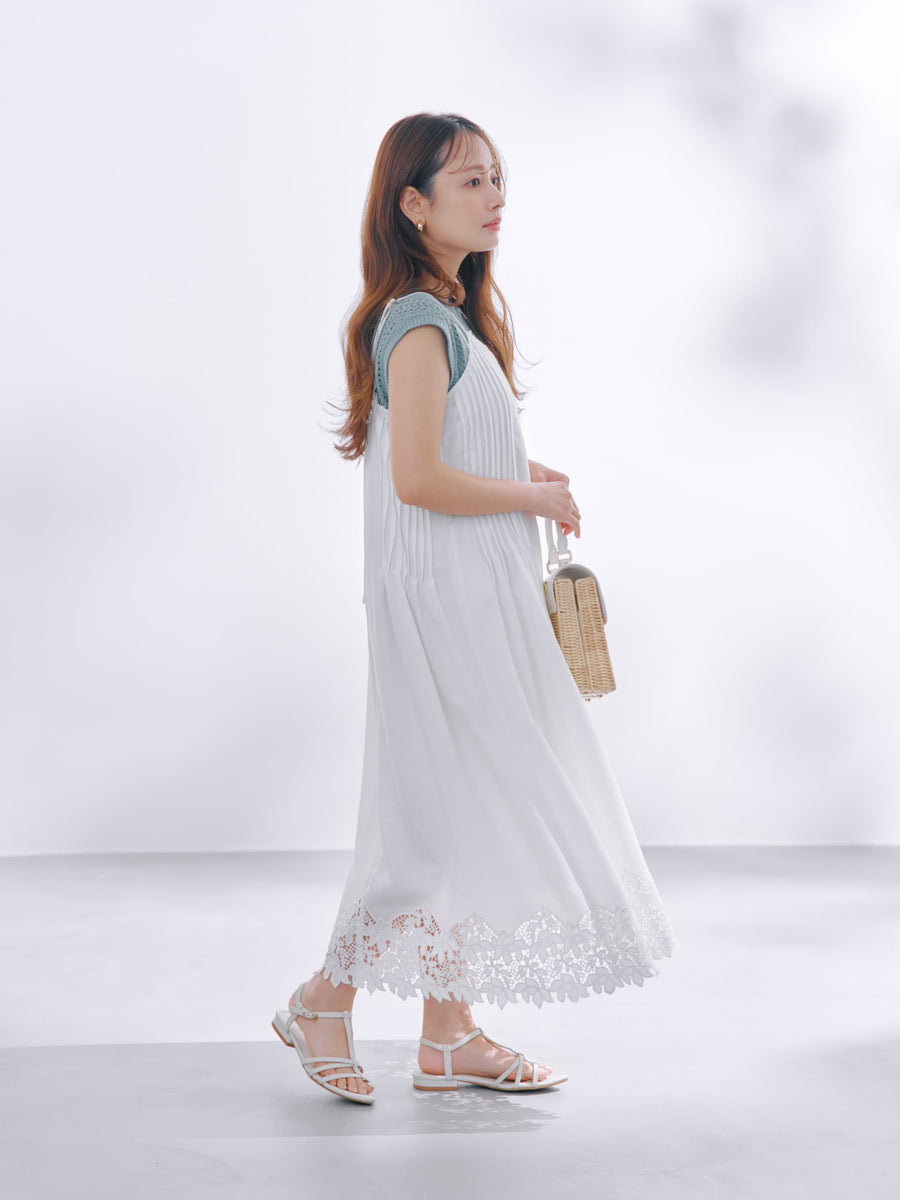 涼しげなカットワークが夏らしいワンピース。甘すぎず大人の方にも安心のデザインで、インナーを変えたりジャケットを羽織ったりコーディネートもしやすい1枚。