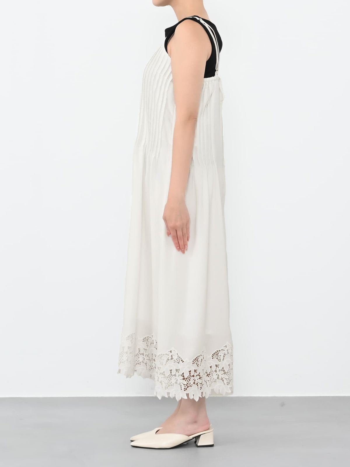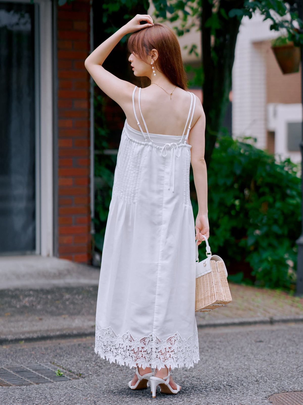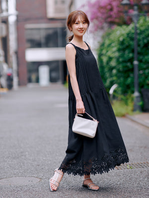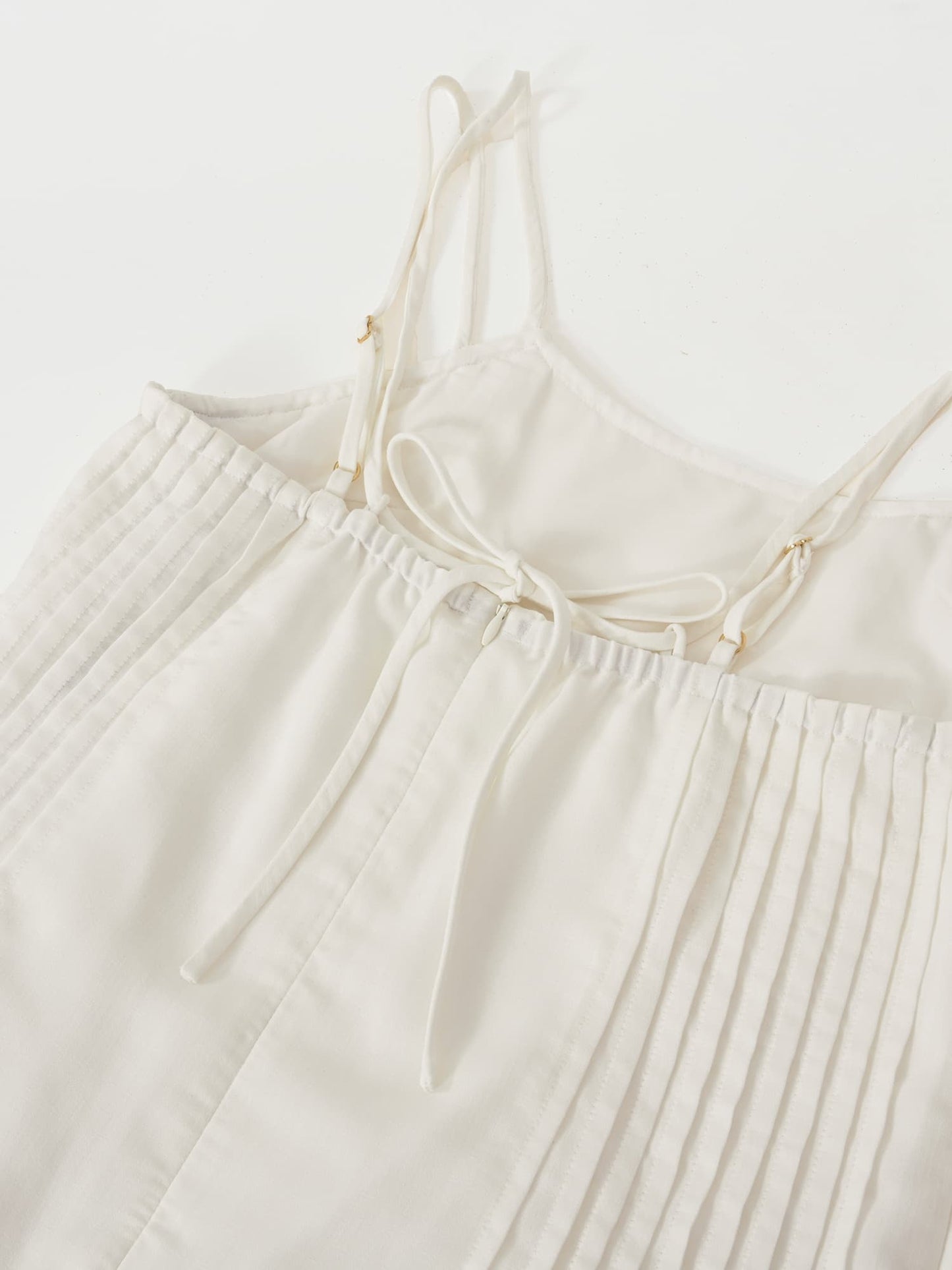 軽やかな生地と相まって、動く度に目を惹くアイテム。サイドに施したピンタックは細見え効果が叶えてくれます。華奢なストラップにすることで、より女性らしさをプラスしました。長さは調節可能なので、お好きな位置で着用いただけます。