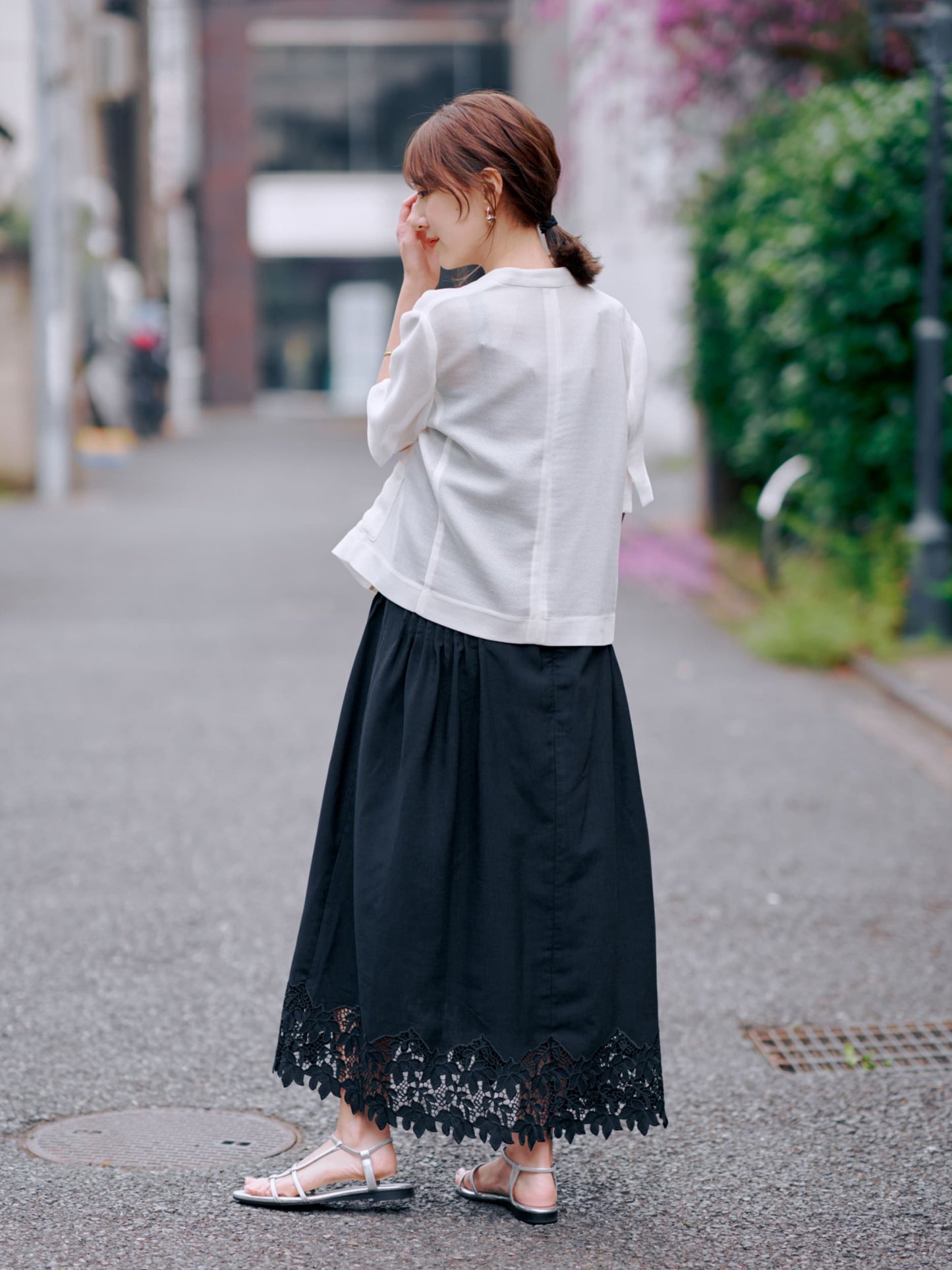 レースに一目惚れで、ブラウスと合わせて購入しました。可愛すぎるかな?と思ってブラックにしたのですが正解でした。大人っぽく着られます!裾のカットワークと透け感が可愛すぎてずっとひらひらさせてしまいます(笑)腕は隠したいですが、背中のリボンは見せたいので、下に何か重ねて着ようと思います。レースが裾だけ&ウエスト切り替えなしで足長効果は無いのが惜しいですが、シリーズのキャミ合わせ前提なのかな〜と思いました(予算オーバーで買えず…)色々書きましたが、とっても気に入ったので大事に着ます!