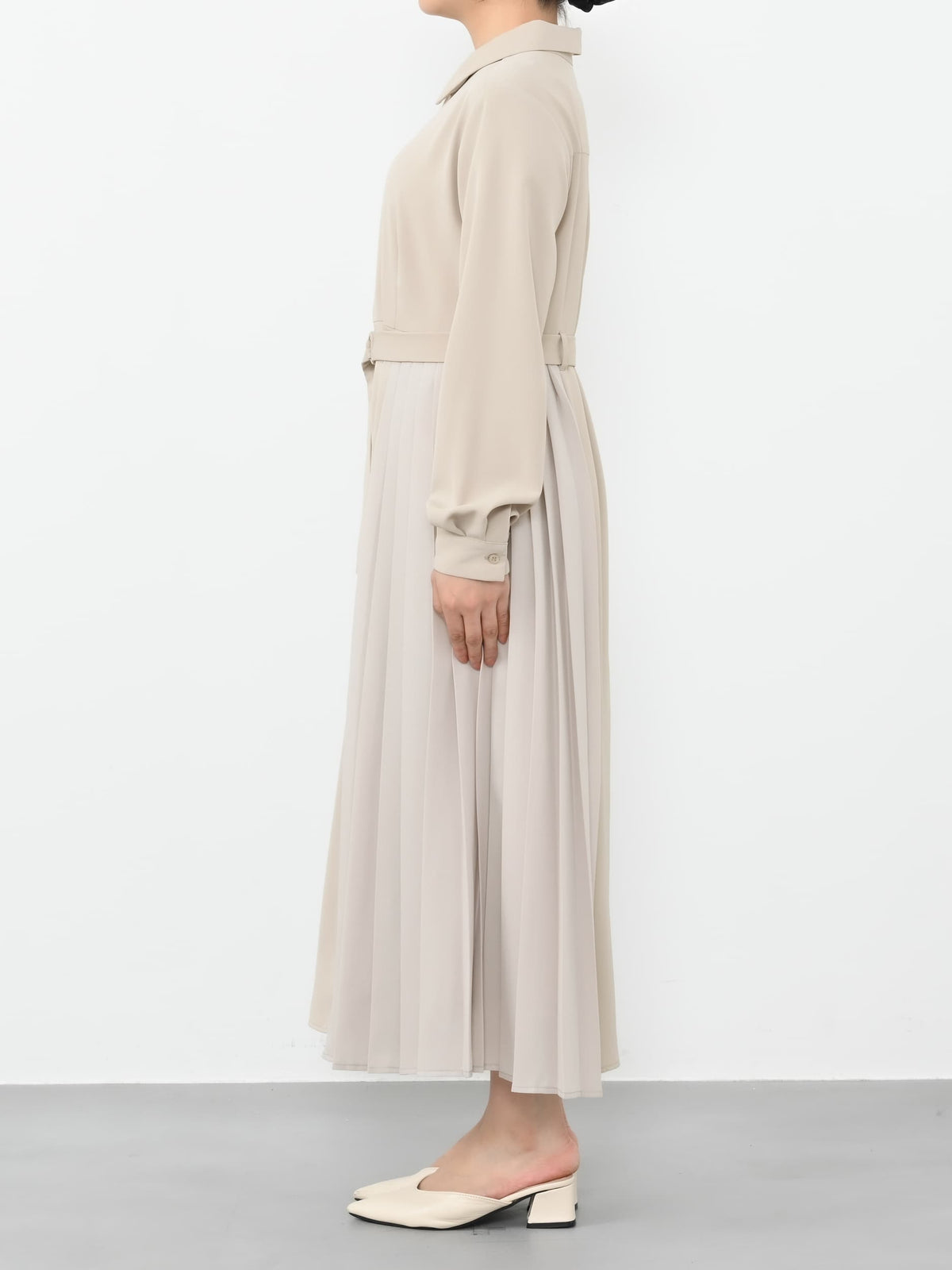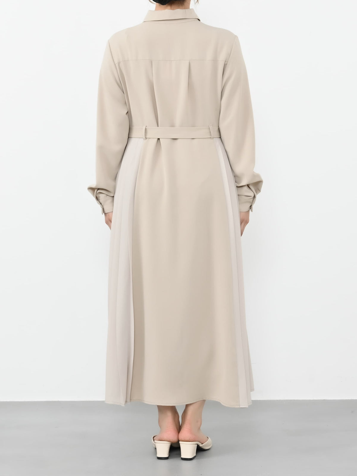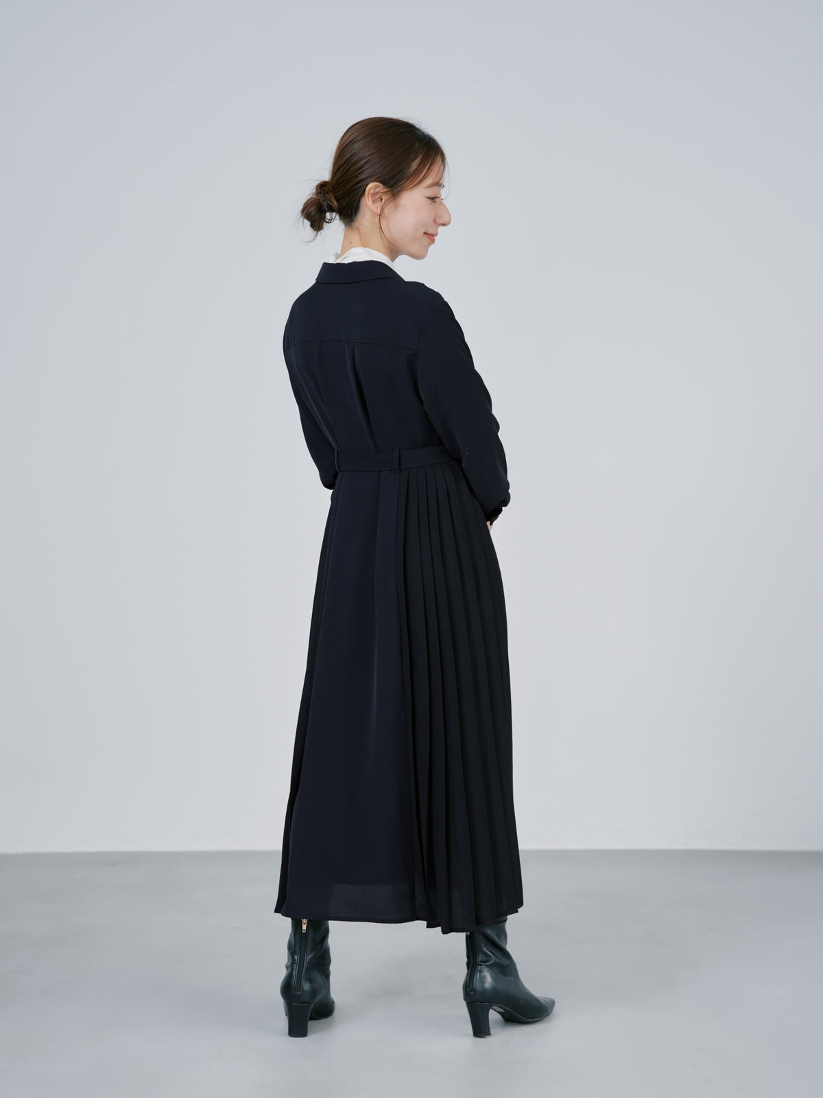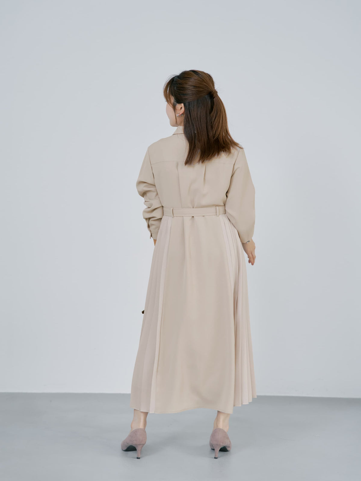 高めのウエスト位置でスタイルアップ、さらにスカート部分のシルエットが小柄な方でもドラマティックさは残しつつ重くならないシルエットになるようこだわりました。付属のベルトでウエストマークすればより洗練された印象に、ベルトを外してストンとしたシルエットでも着用可能。