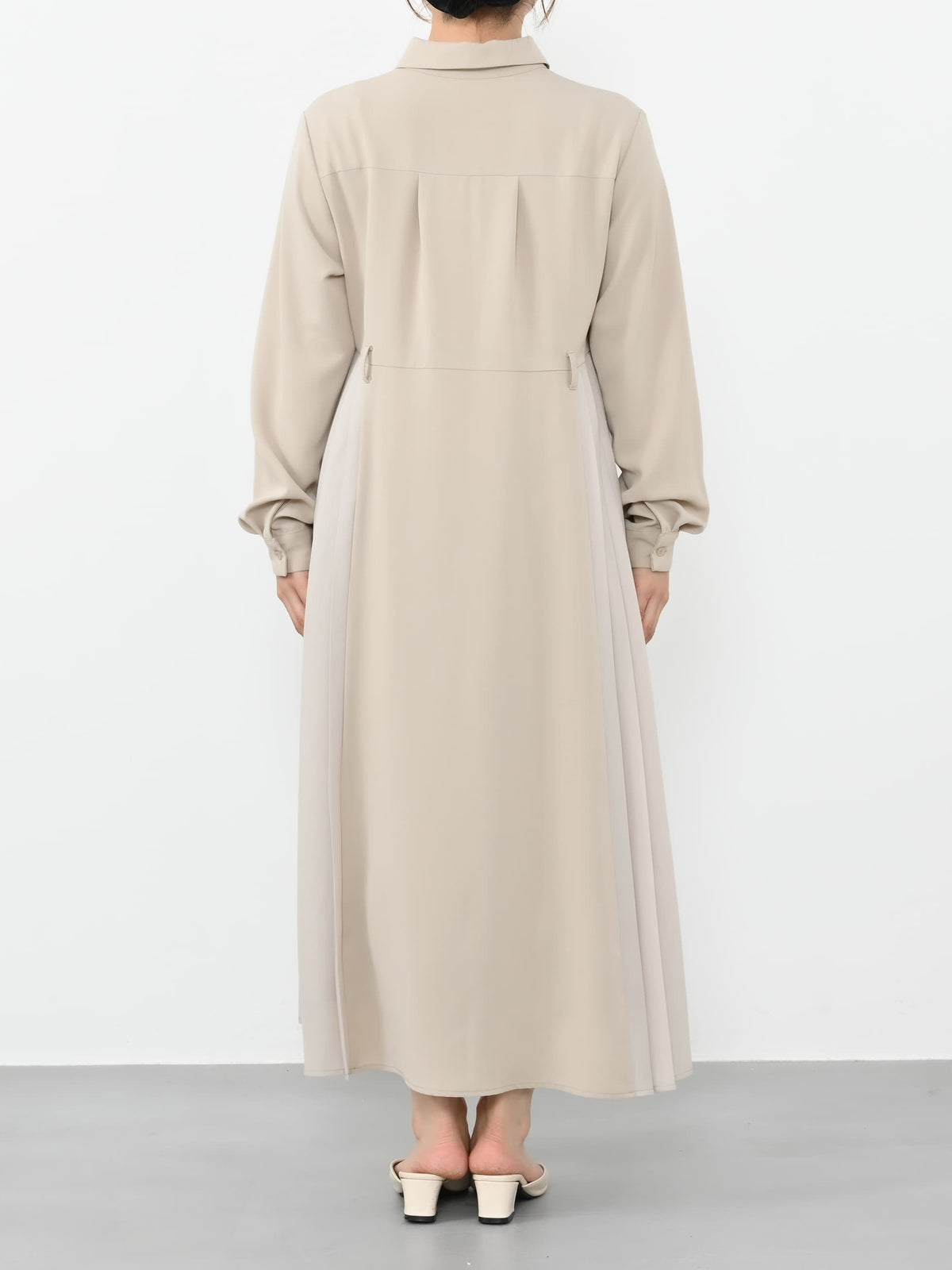 本体はサラッとしたポリエステルの生地を使用し、サイドのプリーツには軽さのあるポリエステルのジョーゼット素材を使用しています。