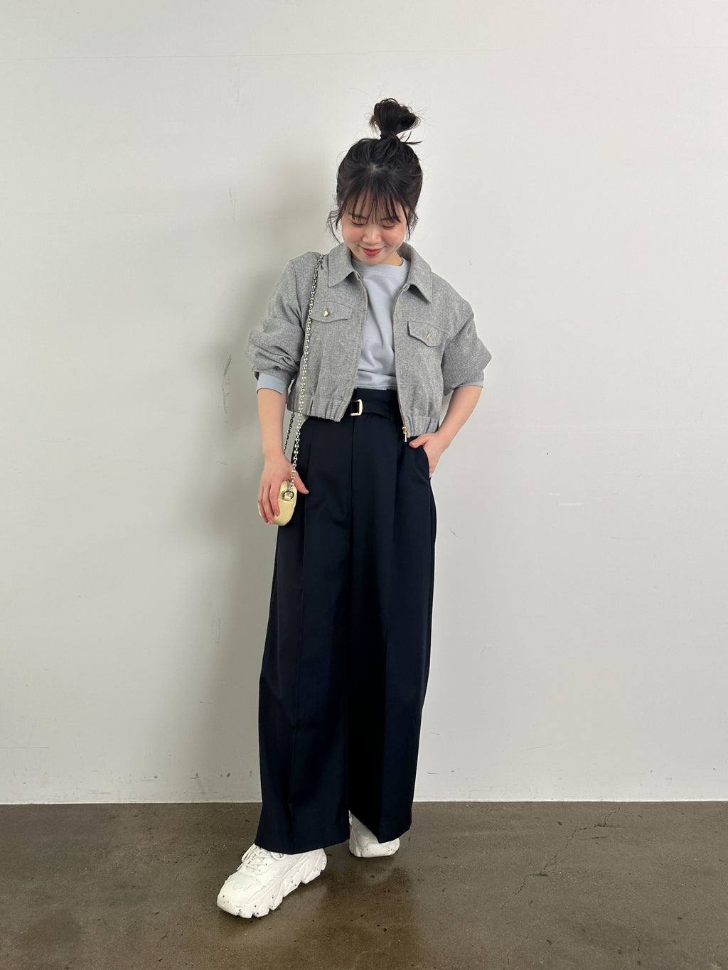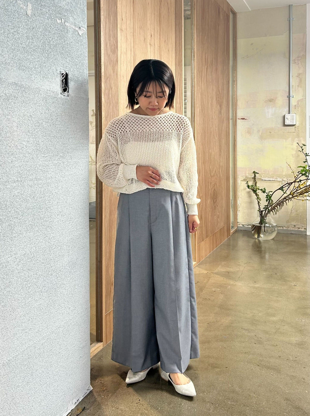 美脚見えが叶うワイドパンツは1枚持っていて間違いなしのアイテムです!初夏らしい軽やかな素材なので、着心地がとてもいいです。身長152cmで足首あたりの丈感なので、フルレングスで着ることができるのも嬉しいポイントです!