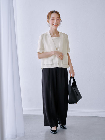 合わせるスタイリングによってオフィスシーンからカジュアルシーンまでオンオフ活躍するアイテムです。同素材で展開しているソフトドビーノーカラージャケットソフトドビーダブルジャケットとセットアップとしても着用できます。