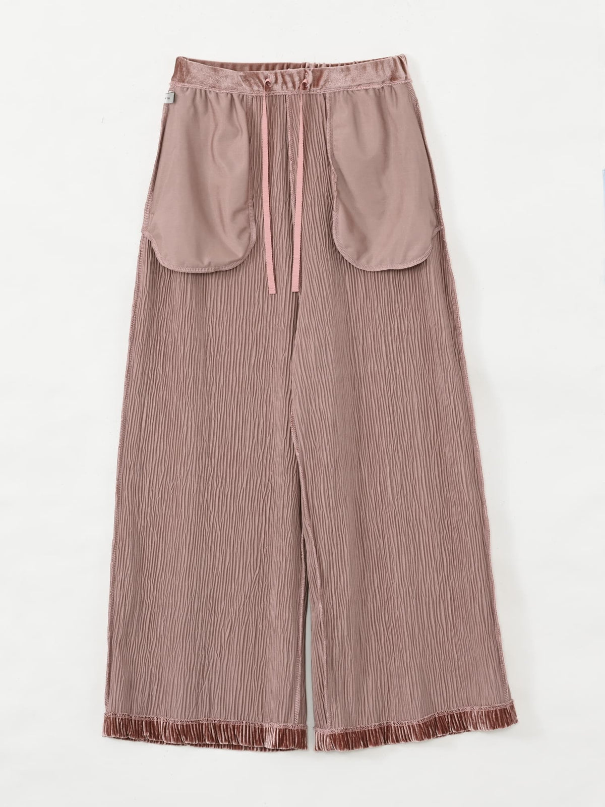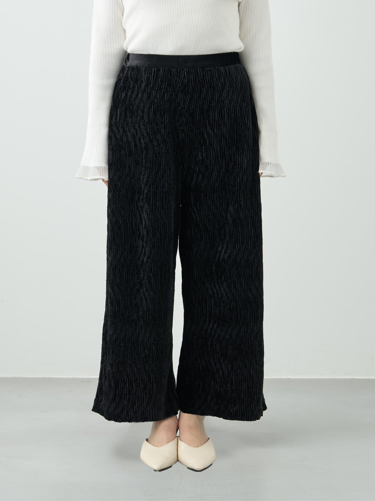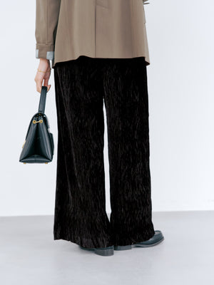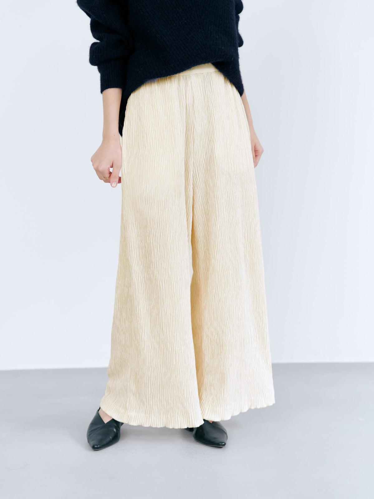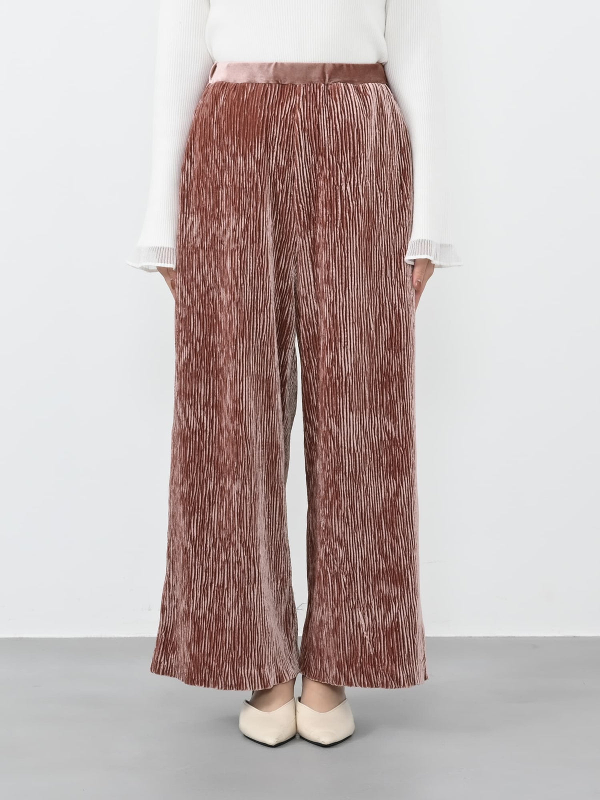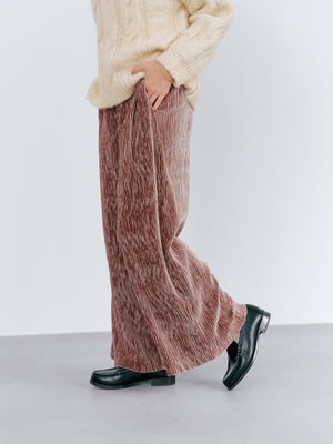 細かい凹凸のプリーツが縦ラインを強調してくれて、小柄さんでもすらっと見える"絶妙ワイド"にこだわりました。やわらかく落ちるベロア素材で、季節感も出るのに重たく見えないのがポイント♡ ウエストはフルゴムでストレスゼロ!リラックス感はそのままに、"キレイ見え"も叶う優秀パンツです。