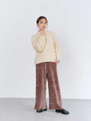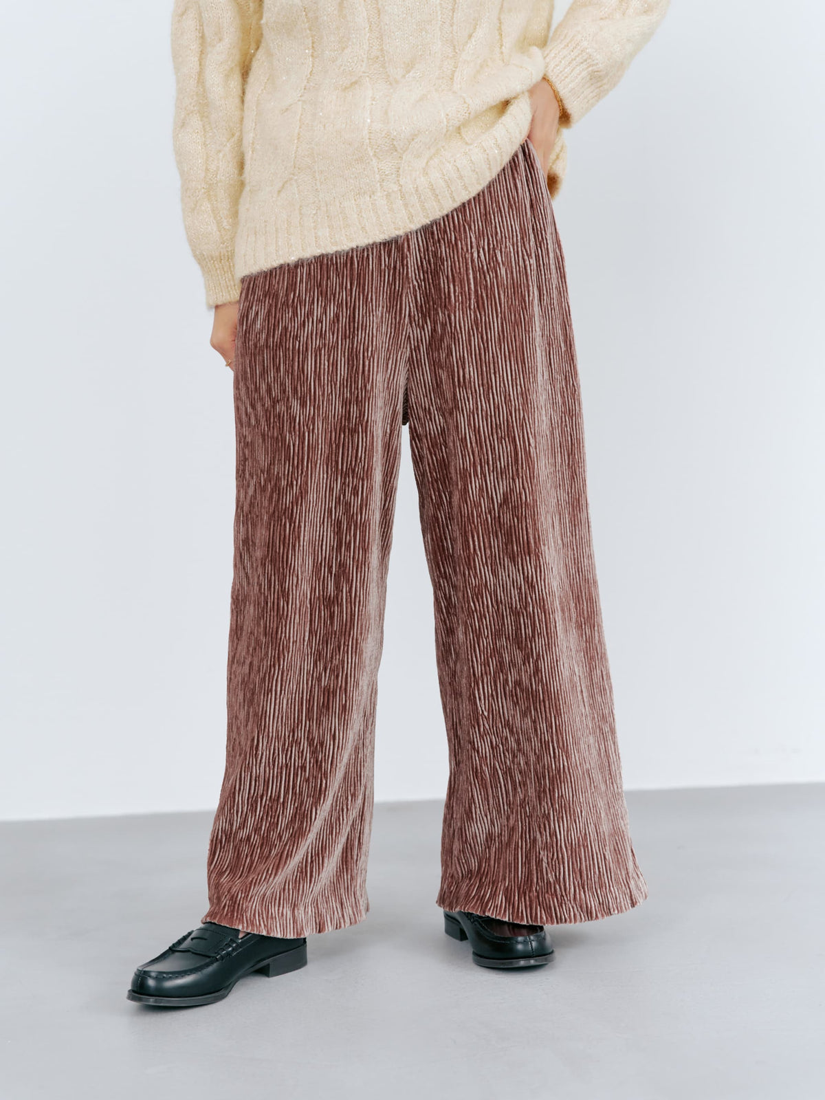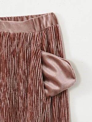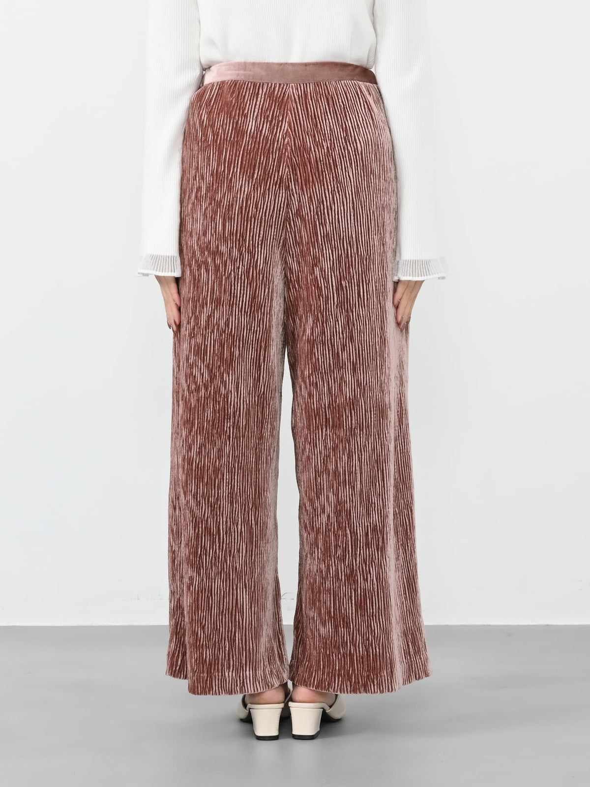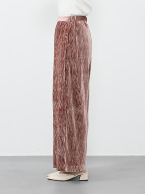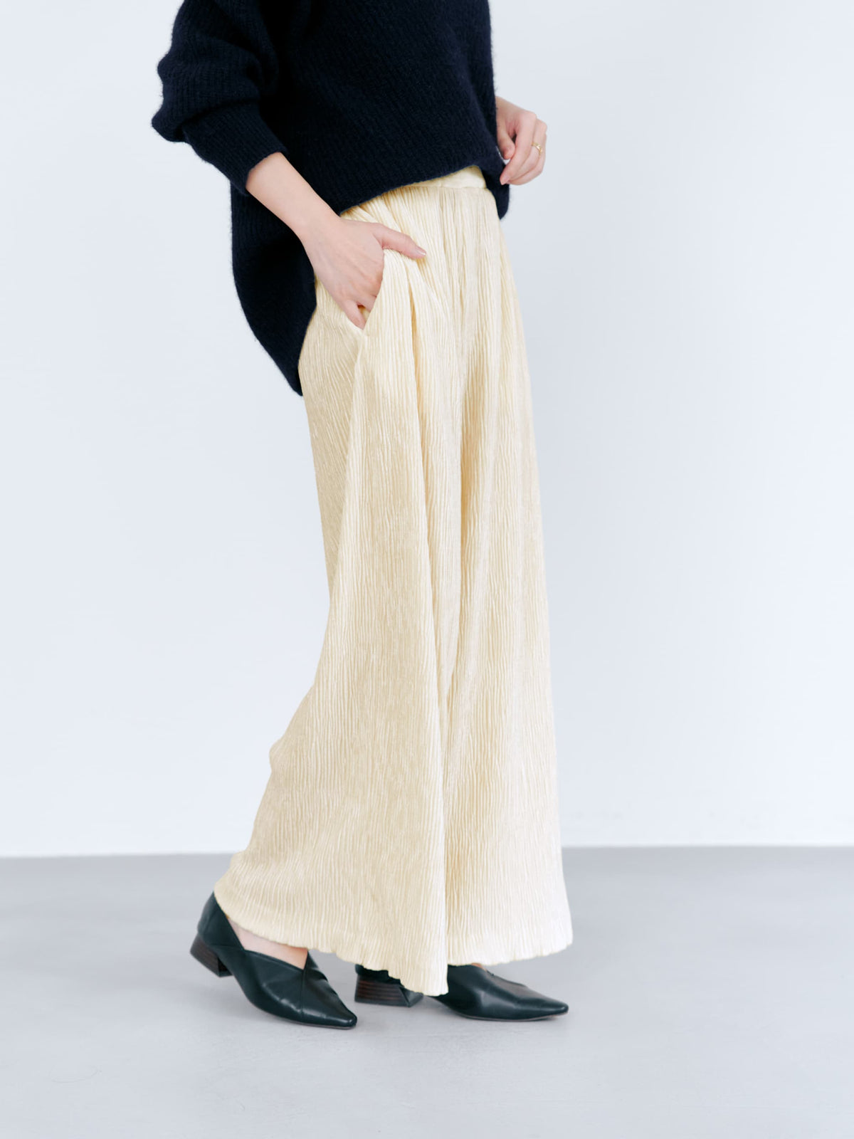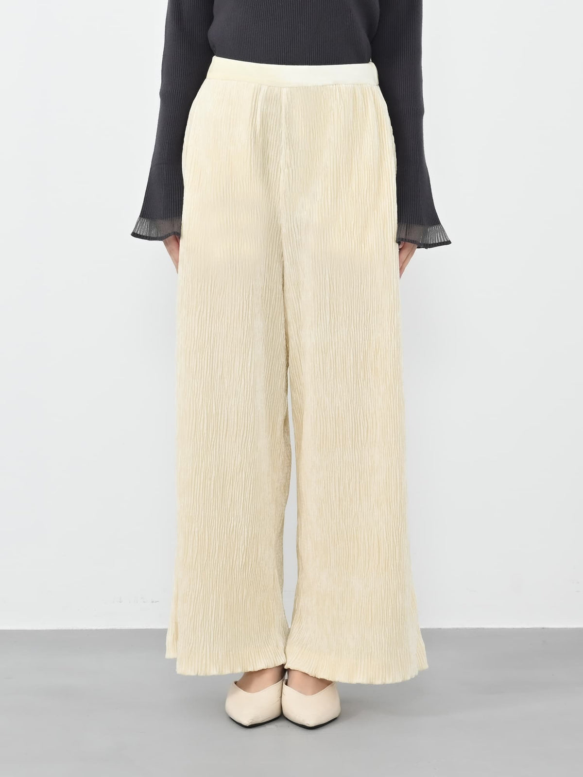 細かい凹凸のプリーツが縦ラインを強調してくれて、小柄さんでもすらっと見える"絶妙ワイド"にこだわりました。やわらかく落ちるベロア素材で、季節感も出るのに重たく見えないのがポイント♡ ウエストはフルゴムでストレスゼロ!リラックス感はそのままに、"キレイ見え"も叶う優秀パンツです。