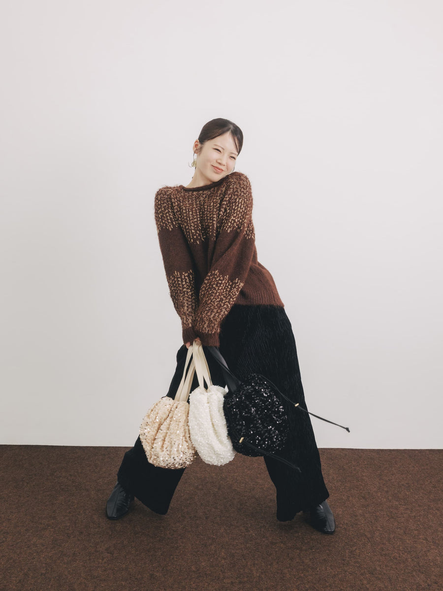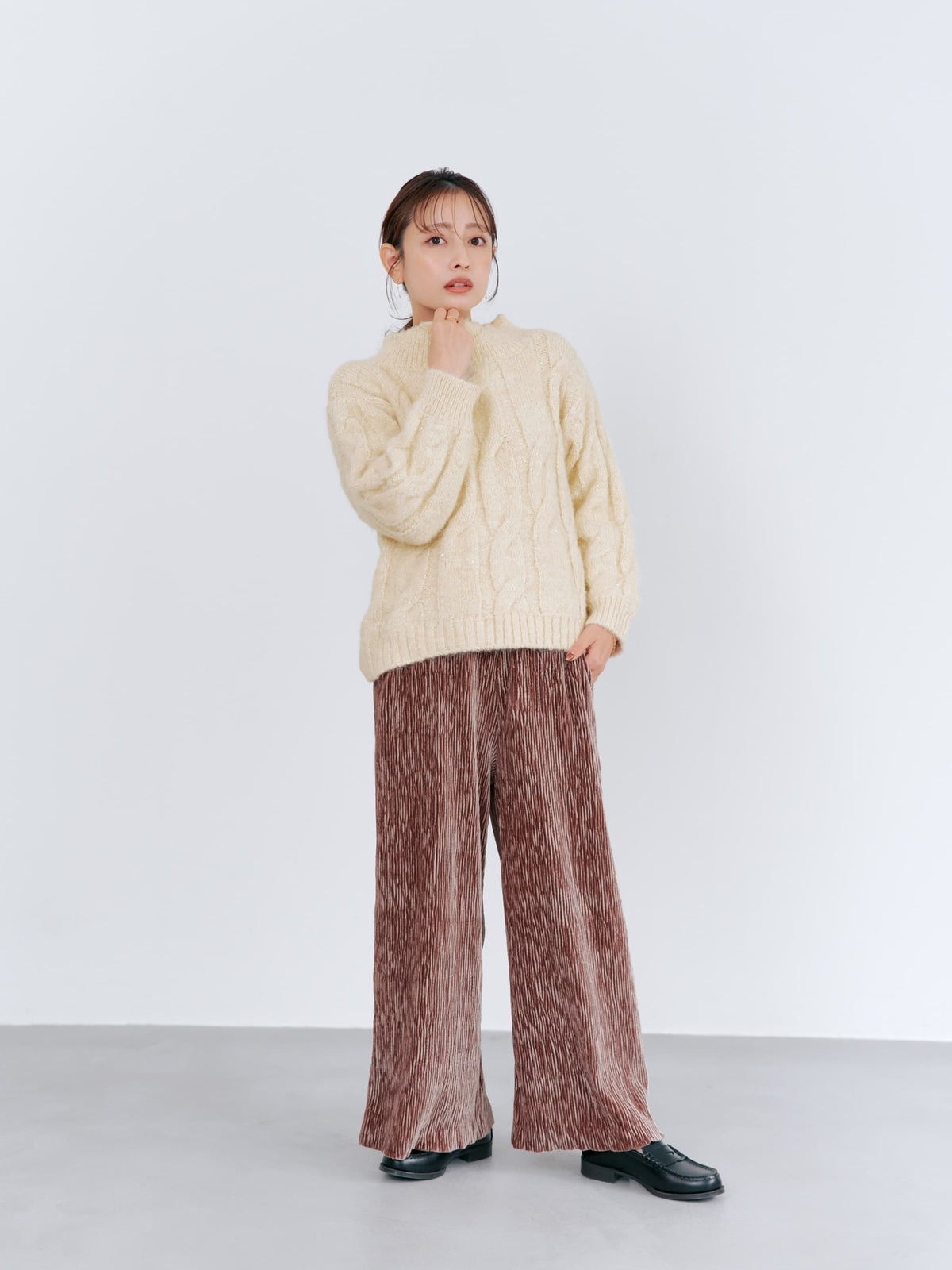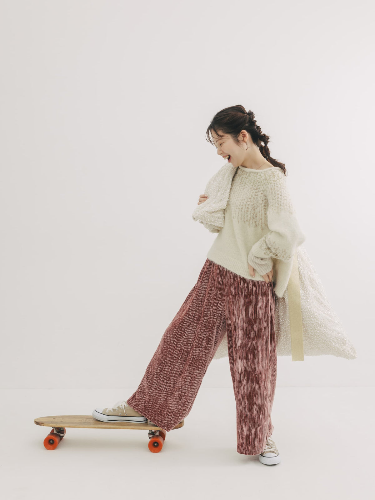 ボリュームのあるニットを軽くフロントインして、プリーツの縦ラインを見せるとスタイルアップが叶います。ゆるニット×ベロアでつくる冬のリラックスコーデもおすすめ。