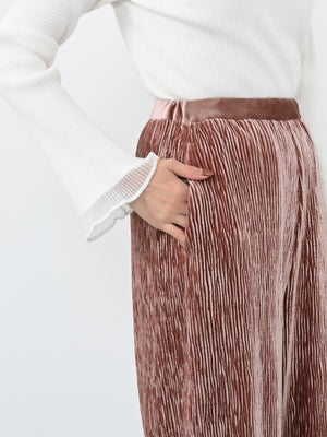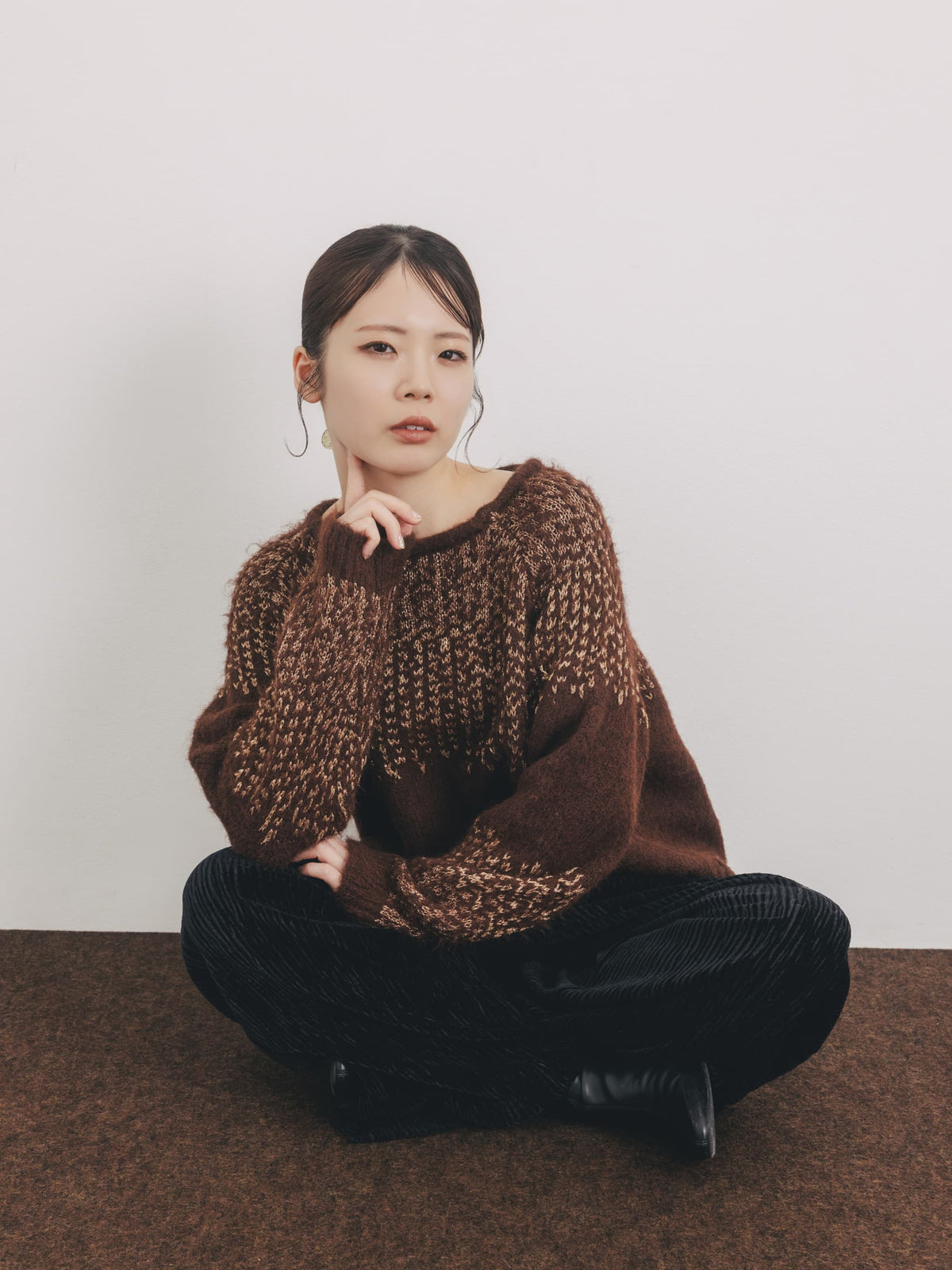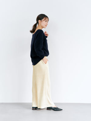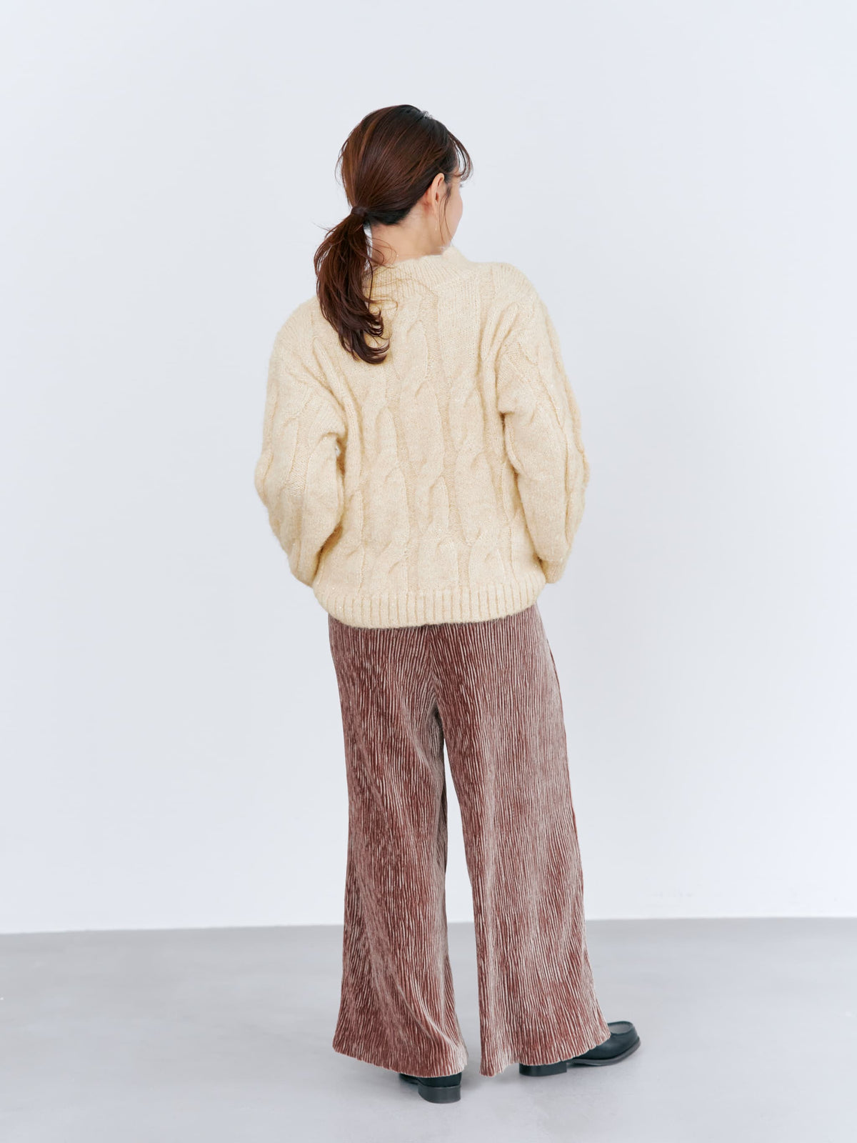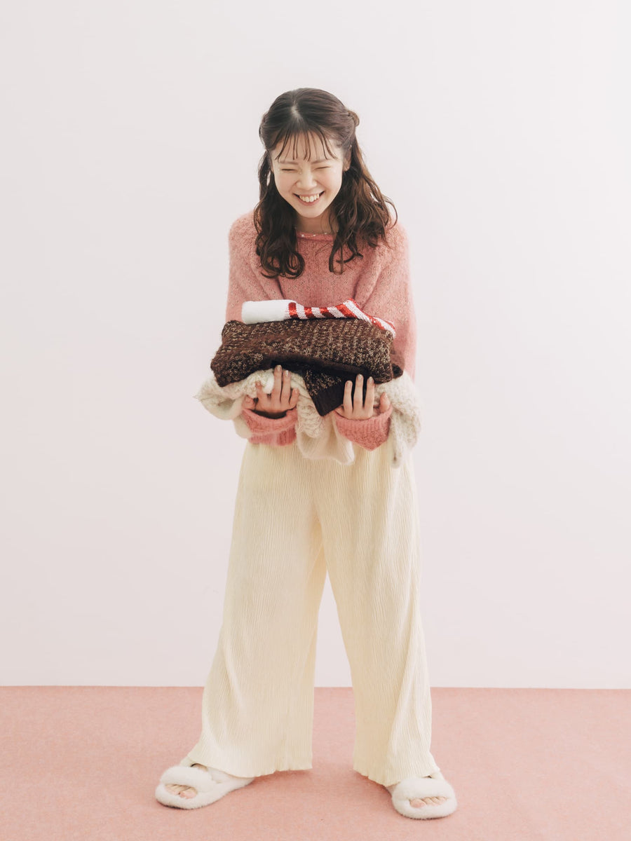 ボリュームのあるニットを軽くフロントインして、プリーツの縦ラインを見せるとスタイルアップが叶います。ゆるニット×ベロアでつくる冬のリラックスコーデもおすすめ。