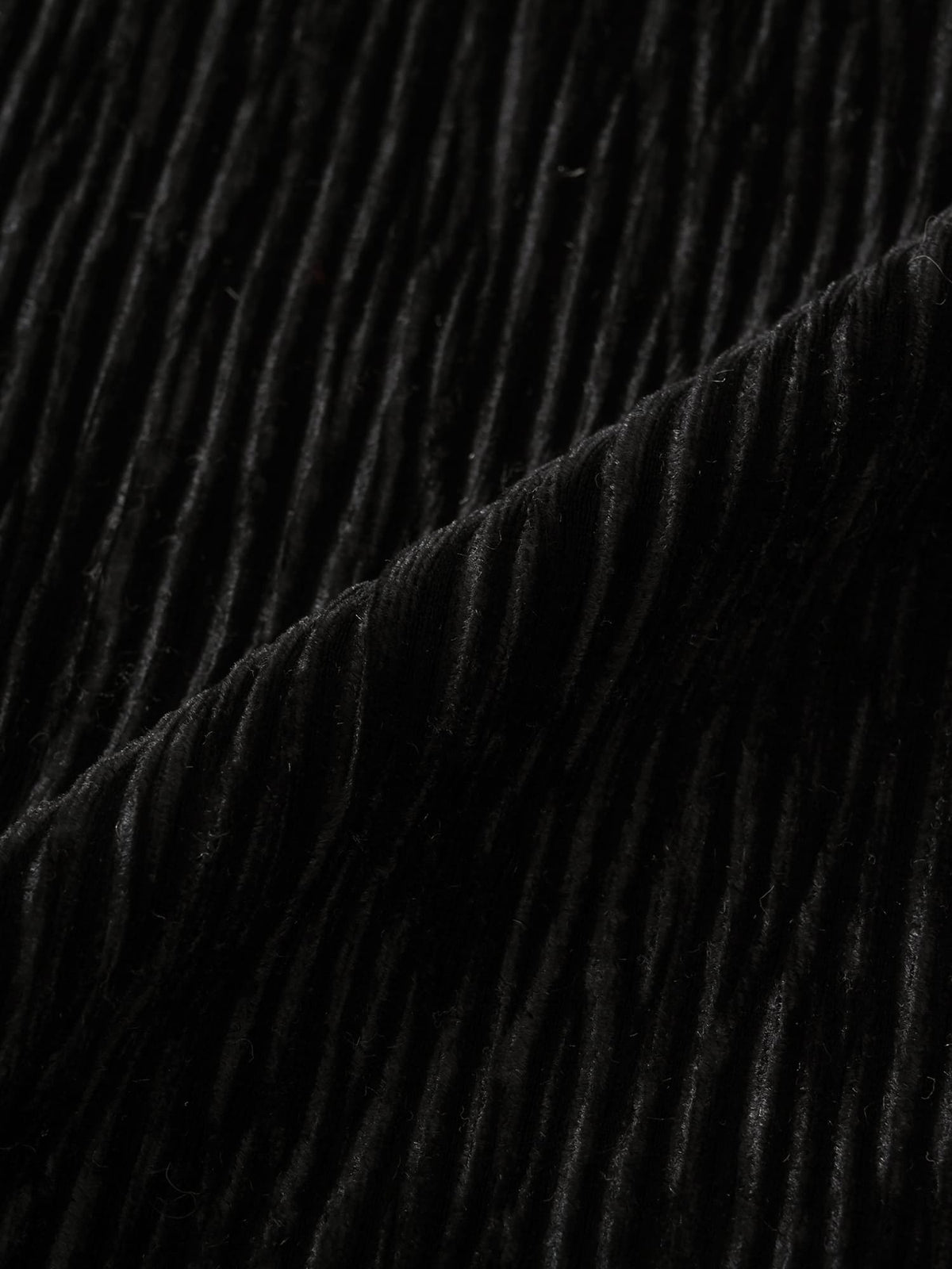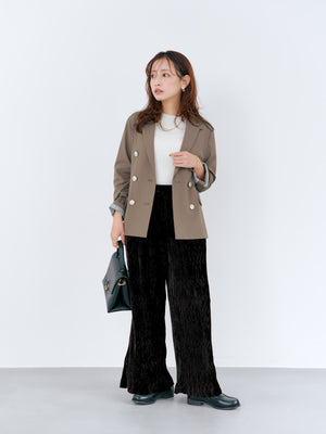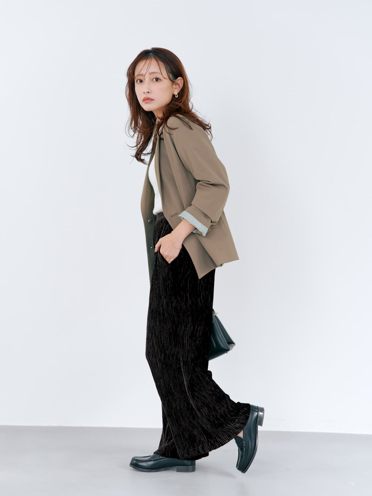 ジャケットを羽織ると一気に上品なムードに。ベロアの陰影が引き締め効果を生み、シンプルなトップスでも“雰囲気のあるコーデ”が完成します。