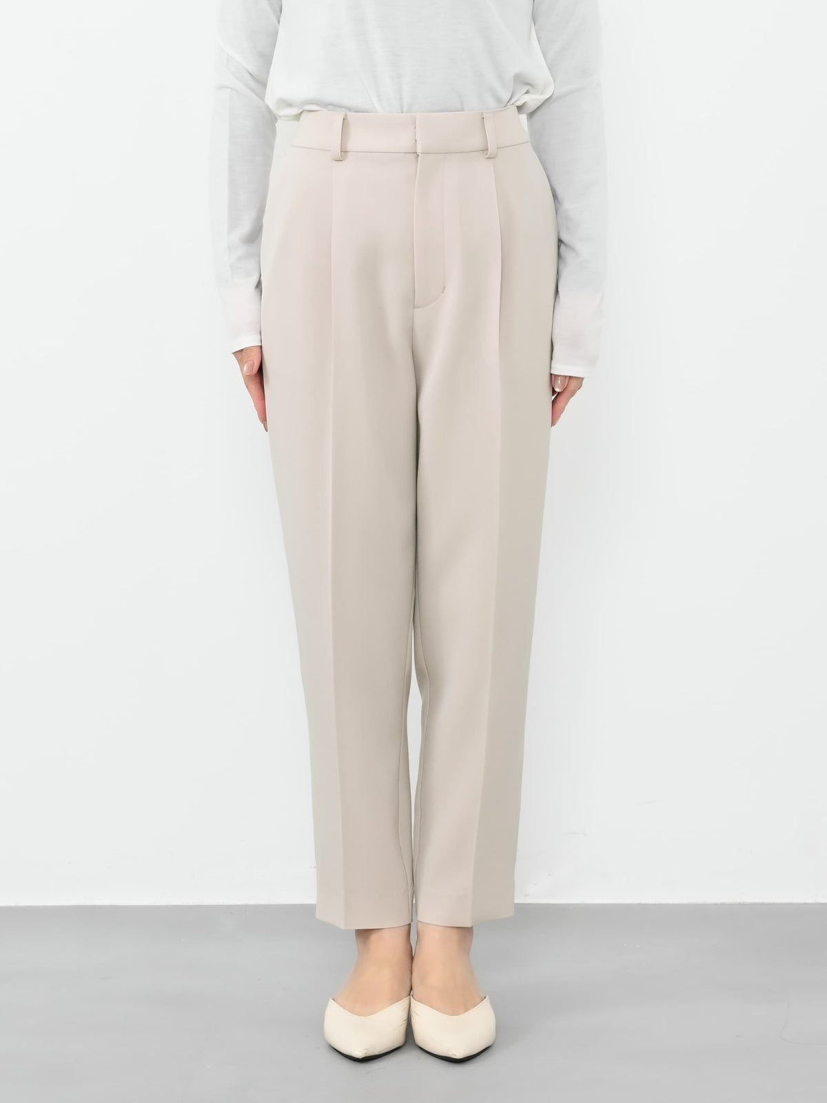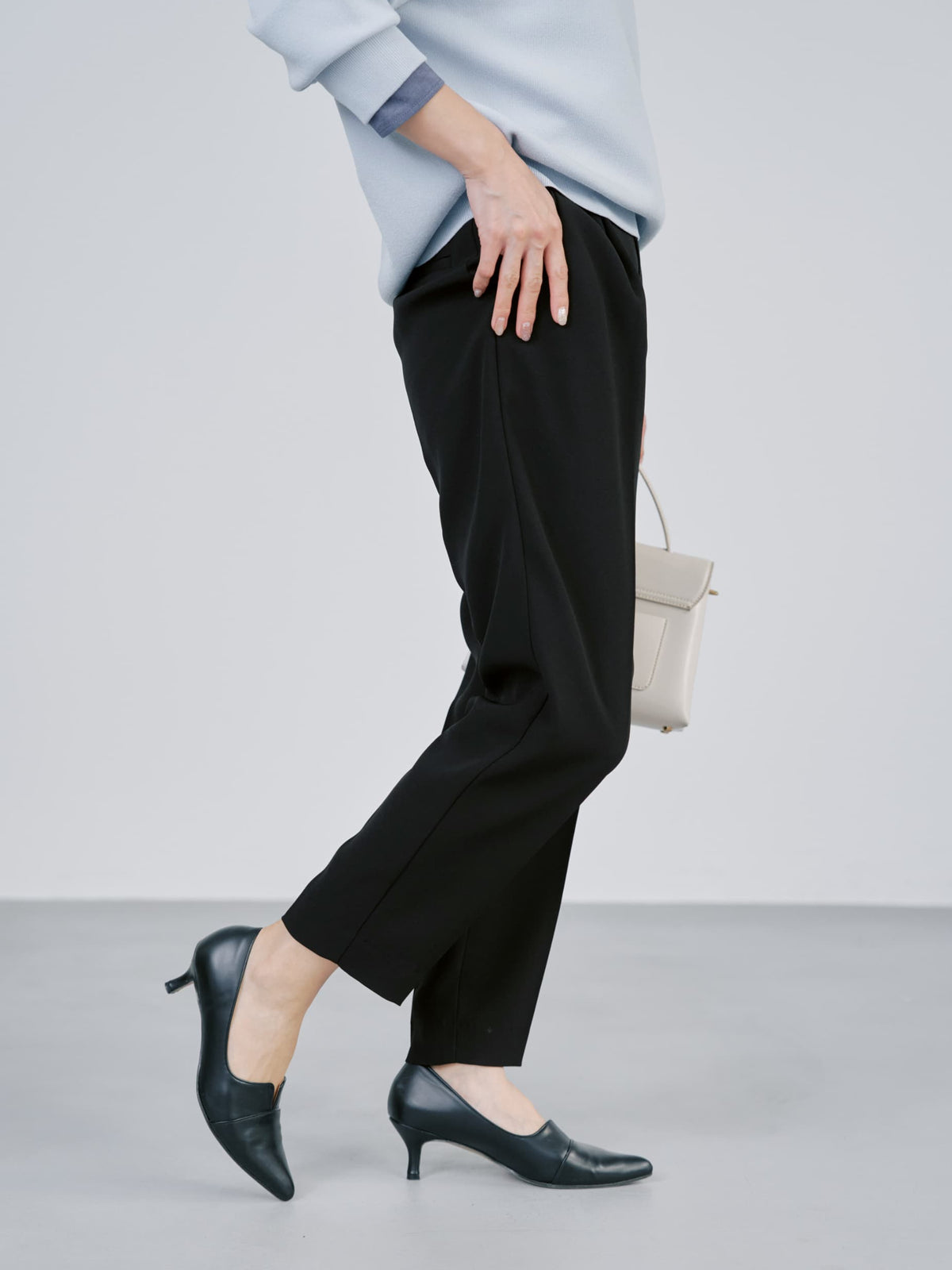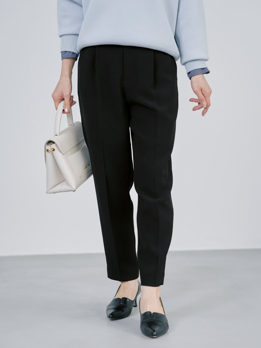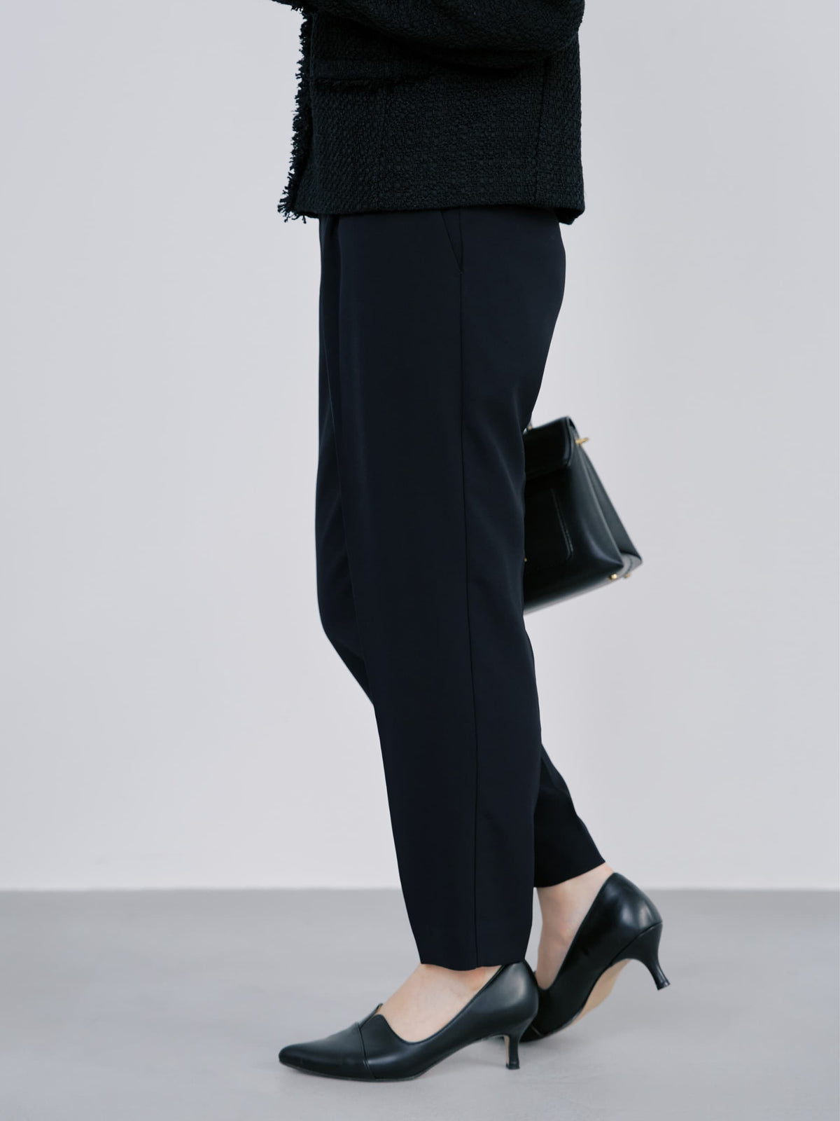 ウエストタックで腰周りをカバーしてくれる、すっきりとしたシルエットのテーパードパンツ。