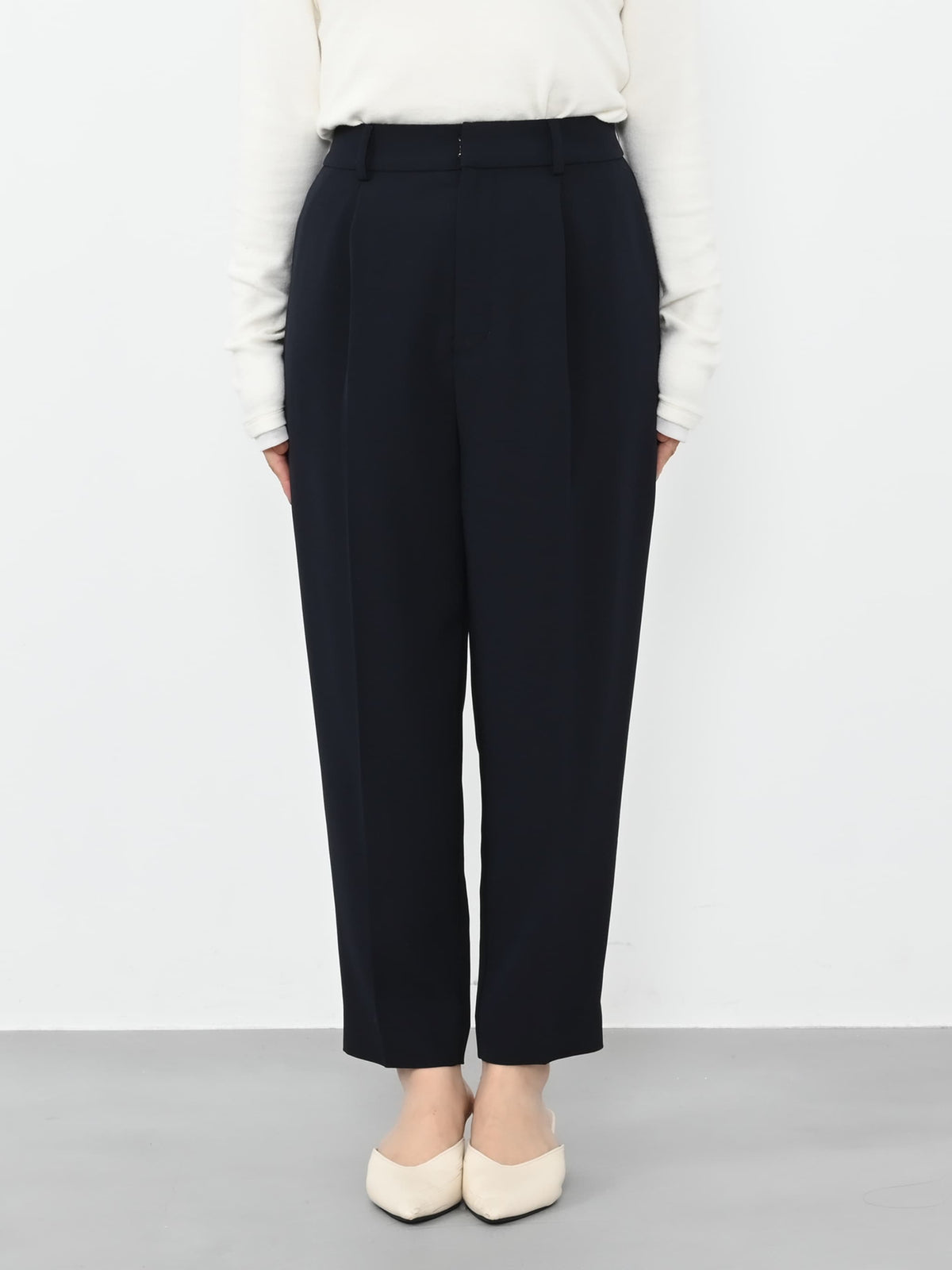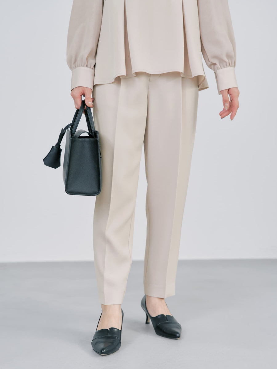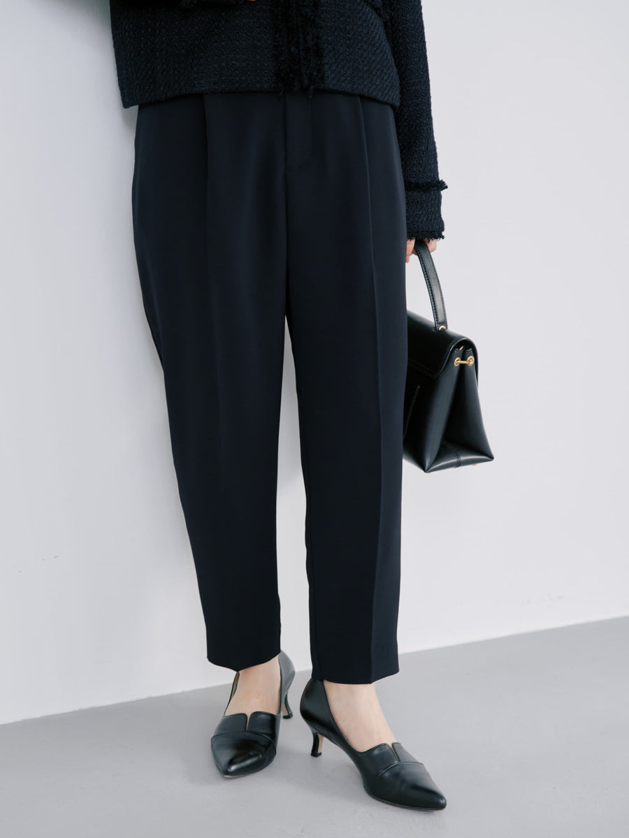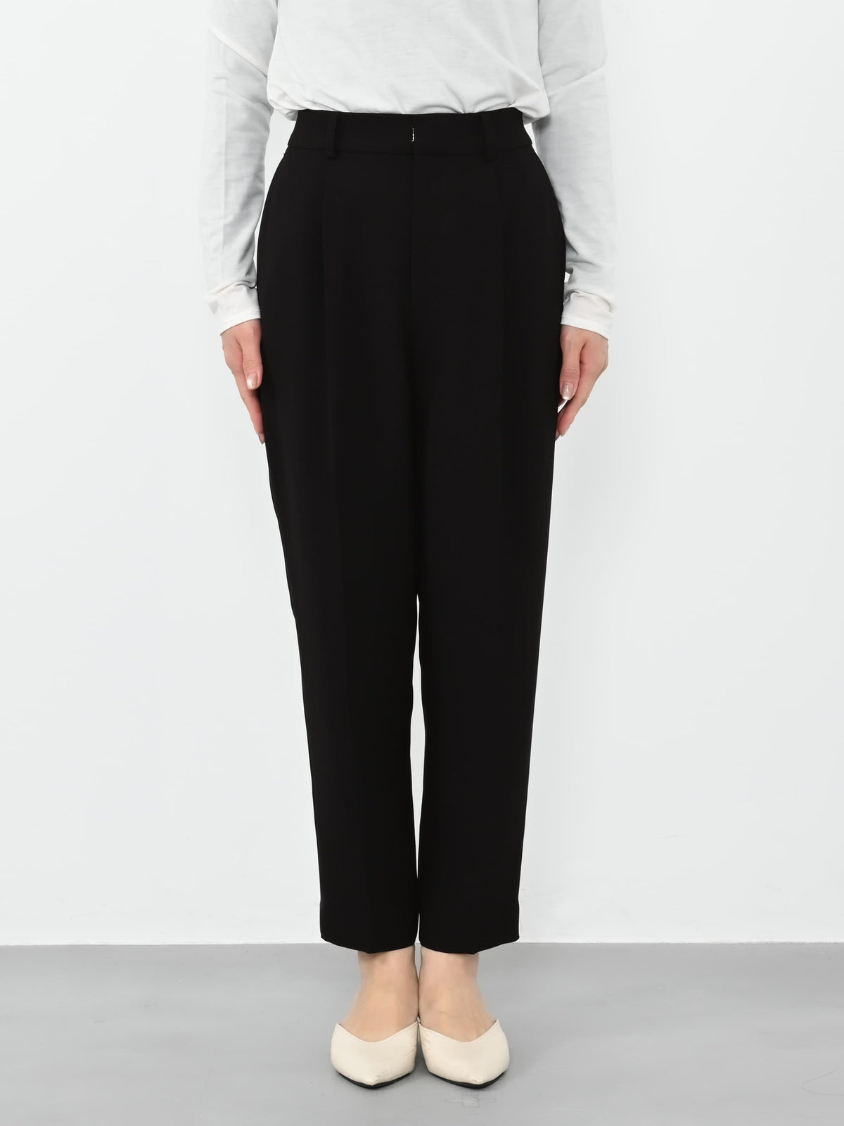 ウエストタックで腰周りをカバーしてくれる、すっきりとしたシルエットのテーパードパンツ。