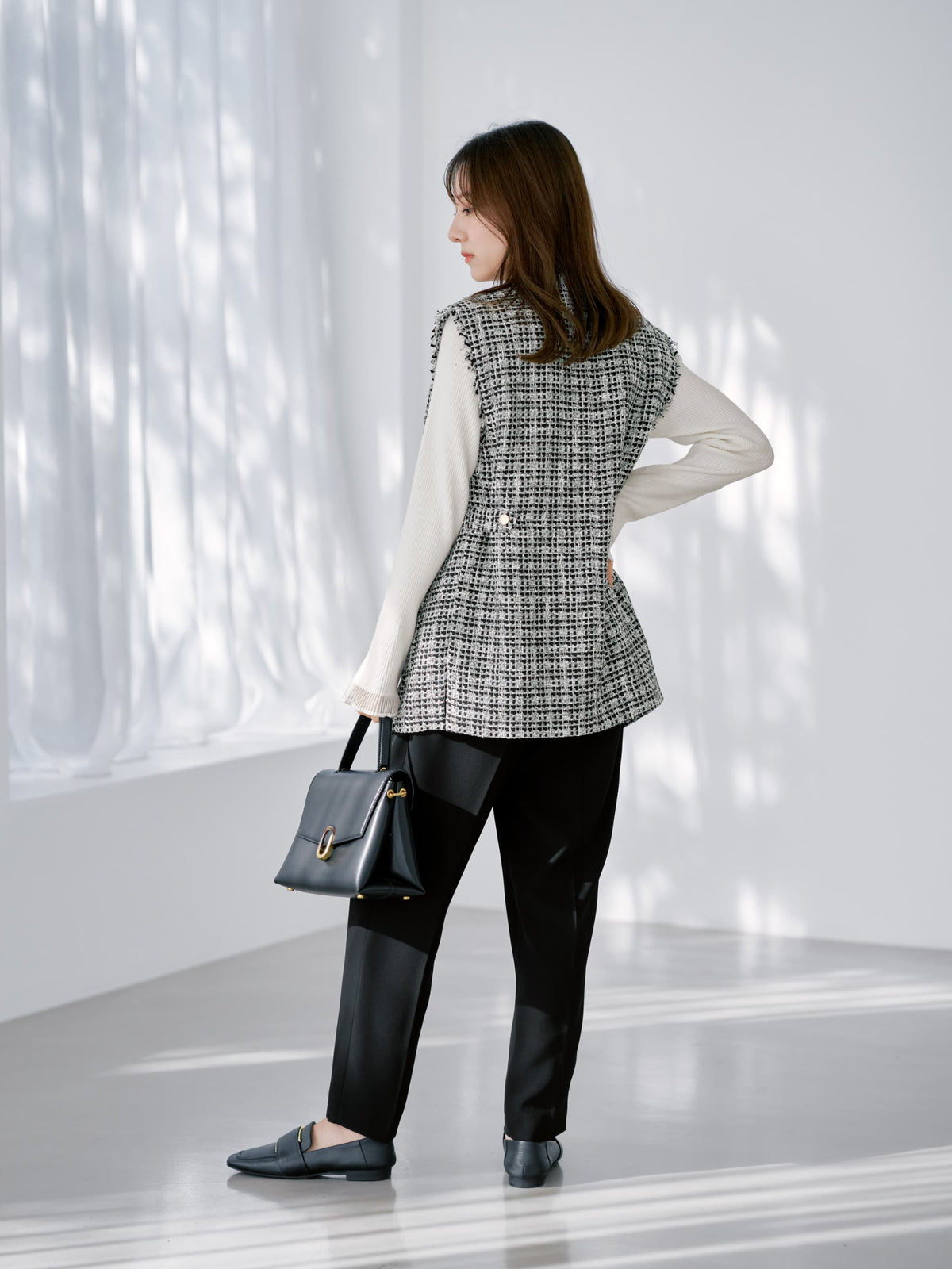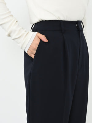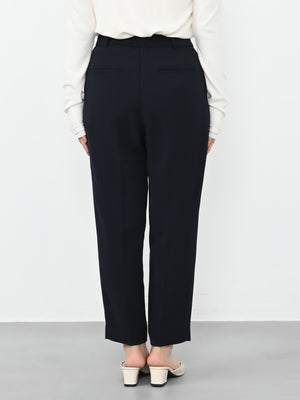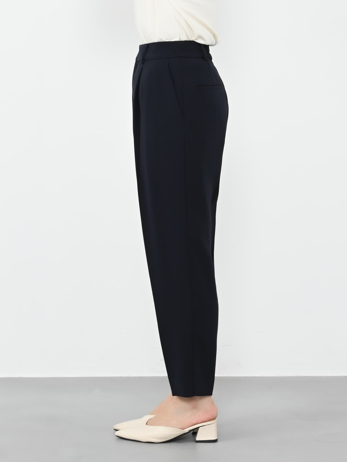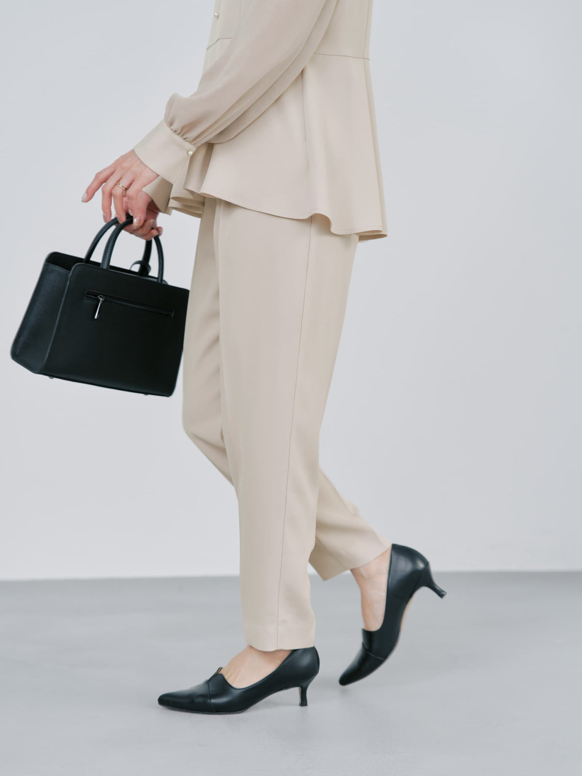 ウエストタックで腰周りをカバーしてくれる、すっきりとしたシルエットのテーパードパンツ。