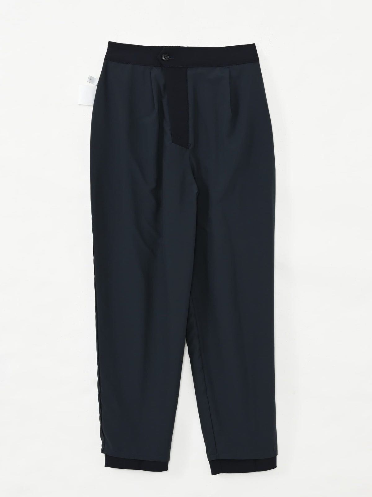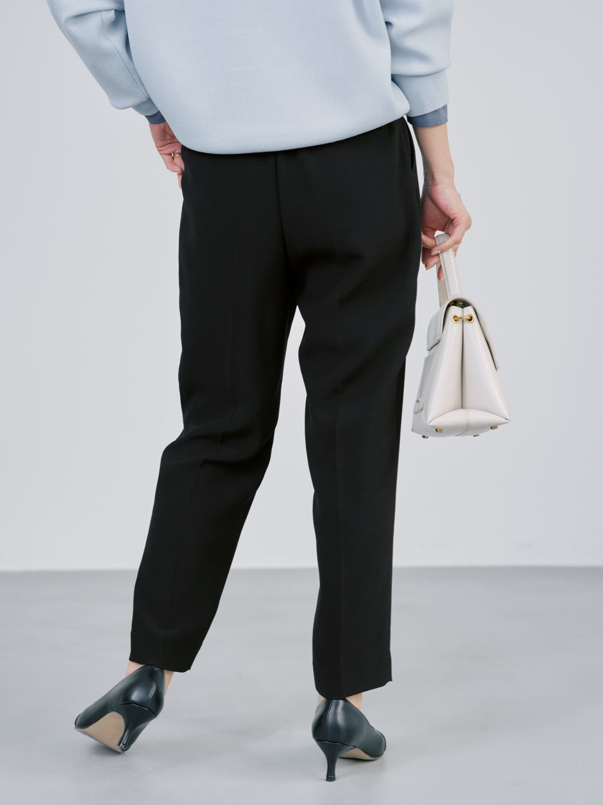 総裏仕様で後ろはウエストゴムになっており、ストレスフリーな履き心地でありながらも綺麗めな印象に仕上げてくれます。ウエストのタックとセンタープレスをつなぐことで、脚のラインを綺麗に見せてくれる効果も◎