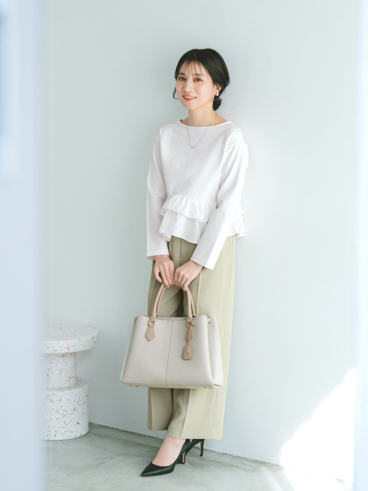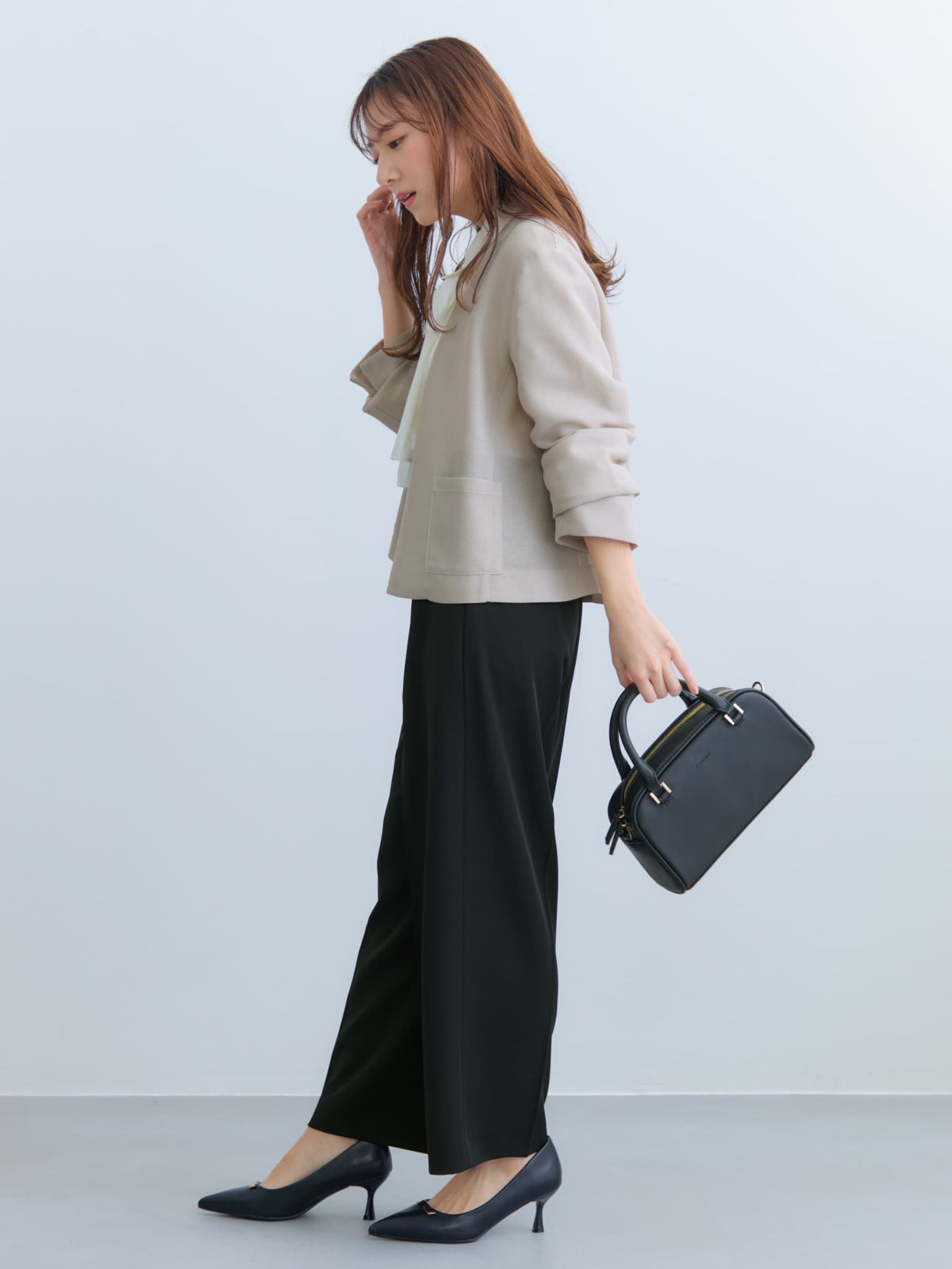 落ち感のある素材が脚のラインをきれいに見せてくれるのがポイント。ワンタック入りで腰回りを自然にカバーしつつ、きちんと感も演出できます◎