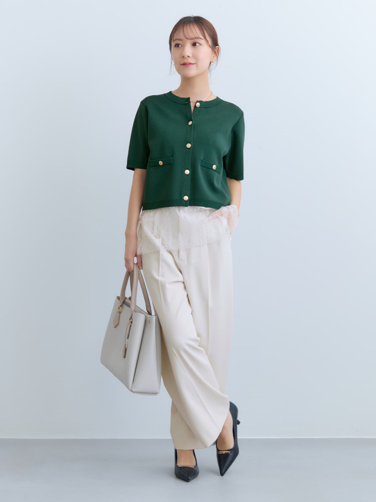 きちんと感のあるブラウスやニット、ジャケットやジレを合わせたオフィススタイルから、ラフなカットソーやスウェットなど、幅広いアイテムとバランスよく馴染みます。