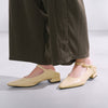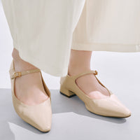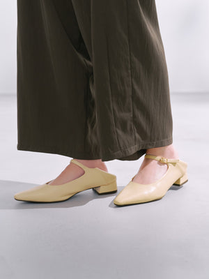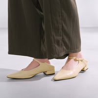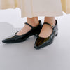 トレンドのメリージェーンを小柄さんが履きやすい2.8cmヒールでお作りしました。足の甲を綺麗に見せるラインや、脚を長く見せる爪先のシェイプにこだわりました。簡単にも履いていただけるよう、かかとを踏める2wayデザインに。ストラップの付け根にはゴムをつけています。疲れにくく、かつ身長を少し盛ってくれる2.8cmヒールです。
