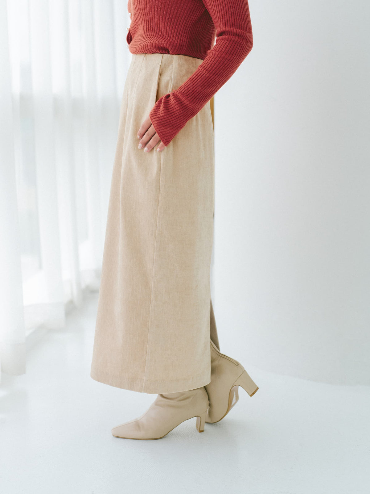 ウエストは程よくフィットし、ゴム仕様でストレスフリーな穿き心地。程よいハイウエストデザインでスタイルUPが叶います。きれいめにもカジュアルにもマッチする、シーズンムード高まる1枚です。