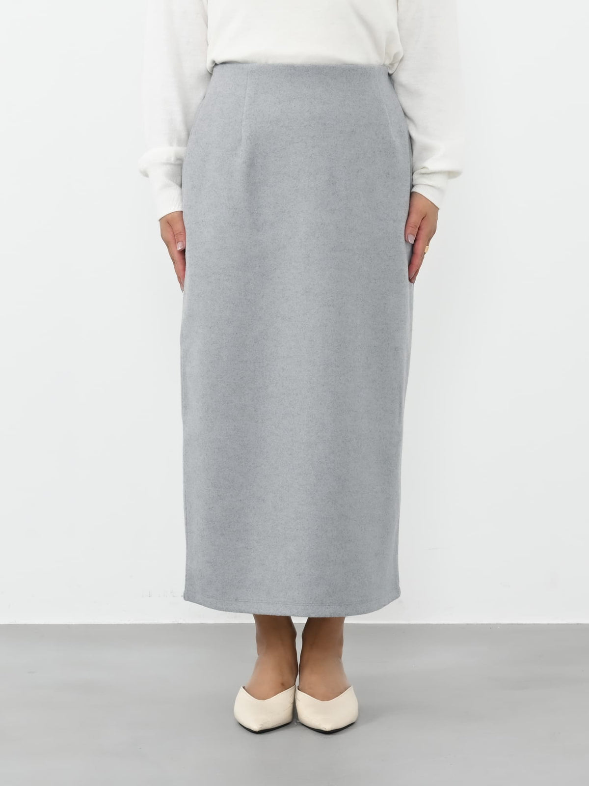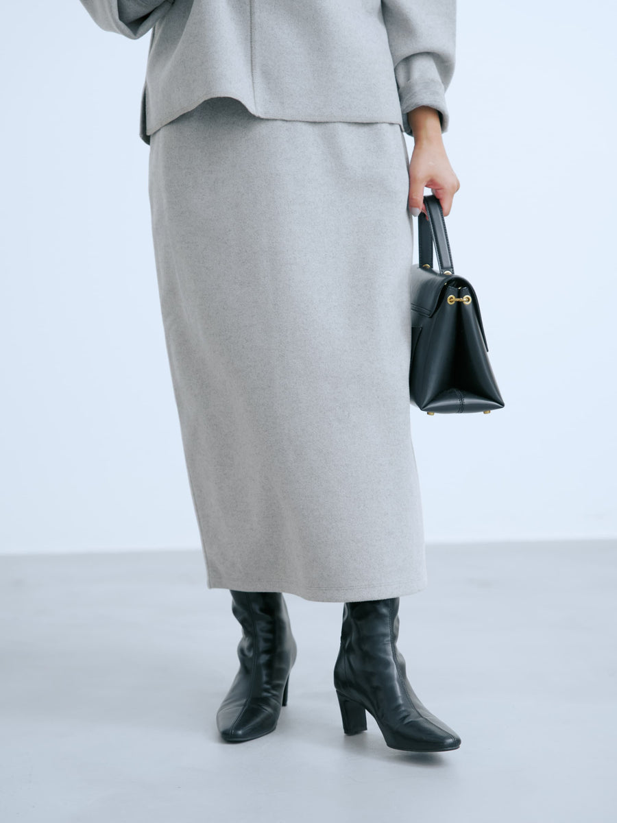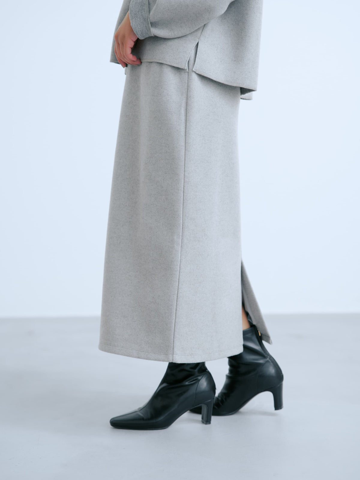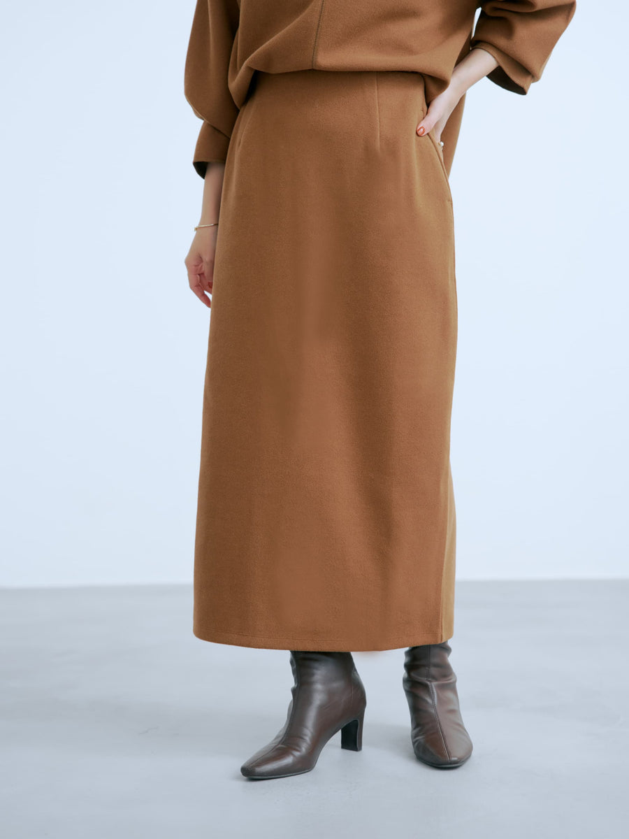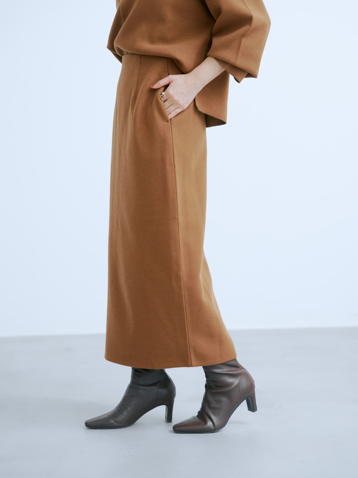 軽くて暖かいウールライクな表情の起毛ジャージーを使用したIラインスカート。