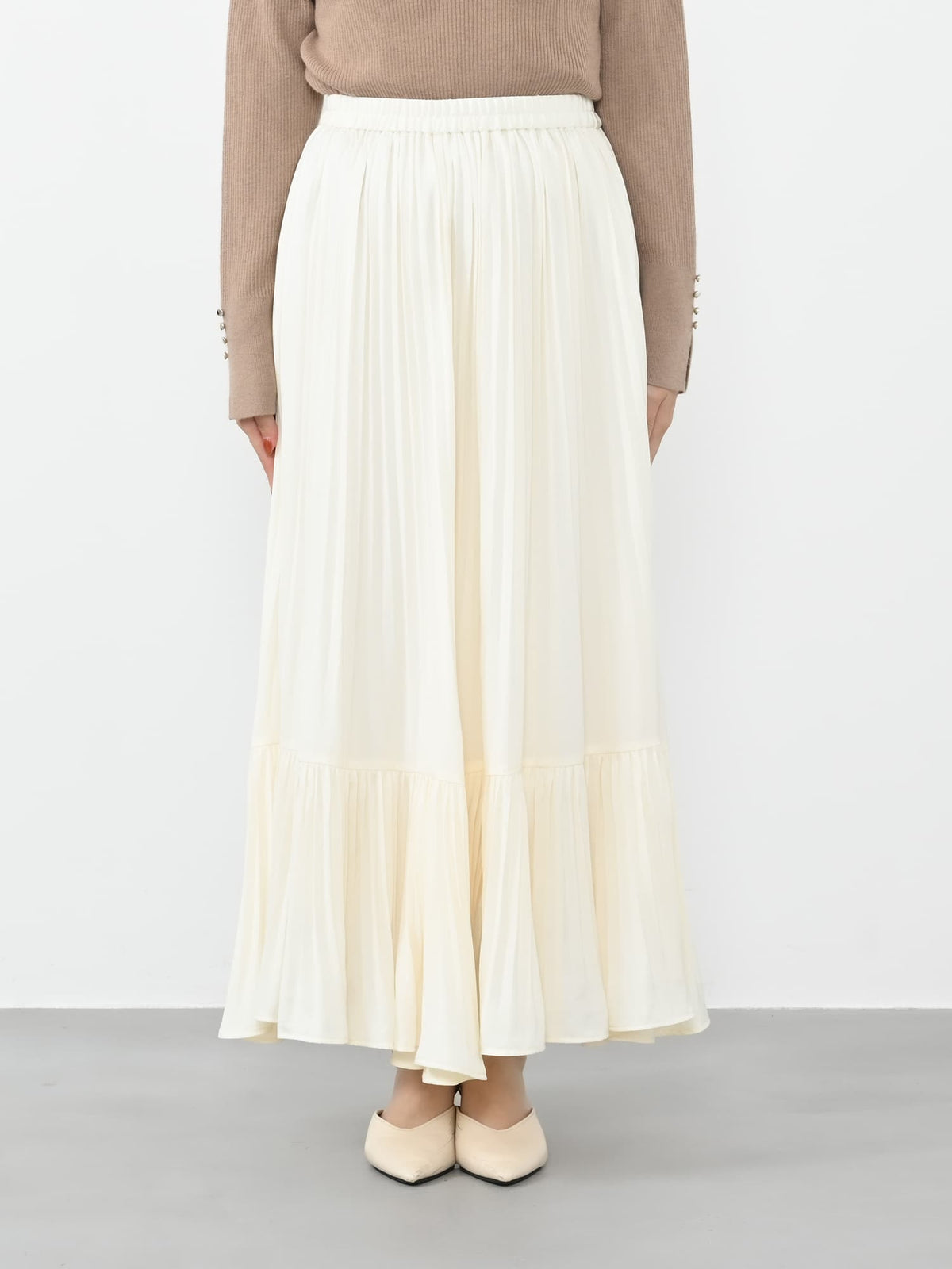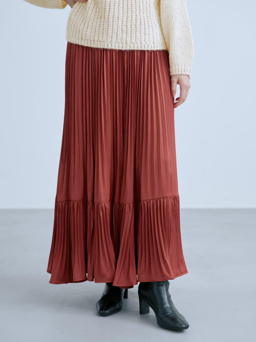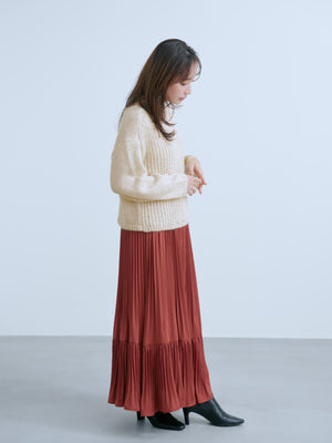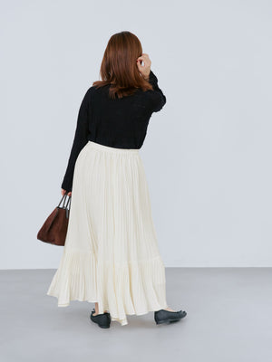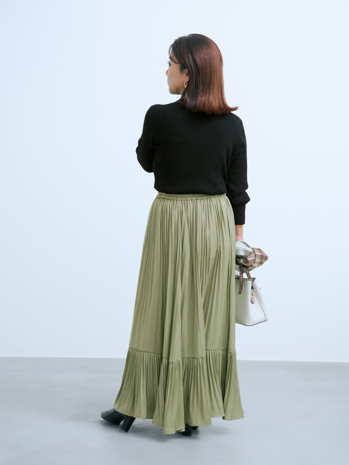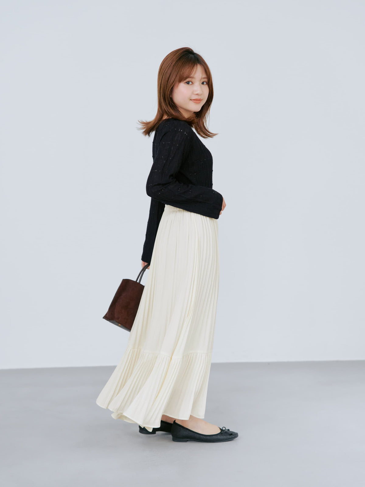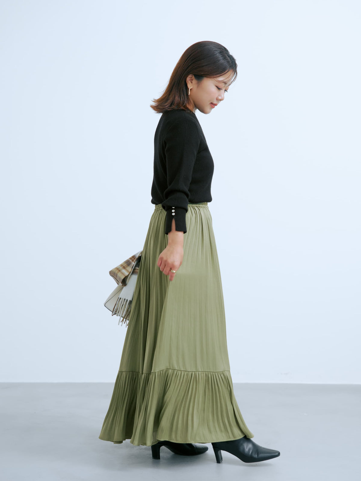 イレヘムデザインでよりドラマチックな足元を演出します。細かいプリーツデザインで縦見え効果も◎コンパクトなニットを合わせるだけでスタイリングが決まります。