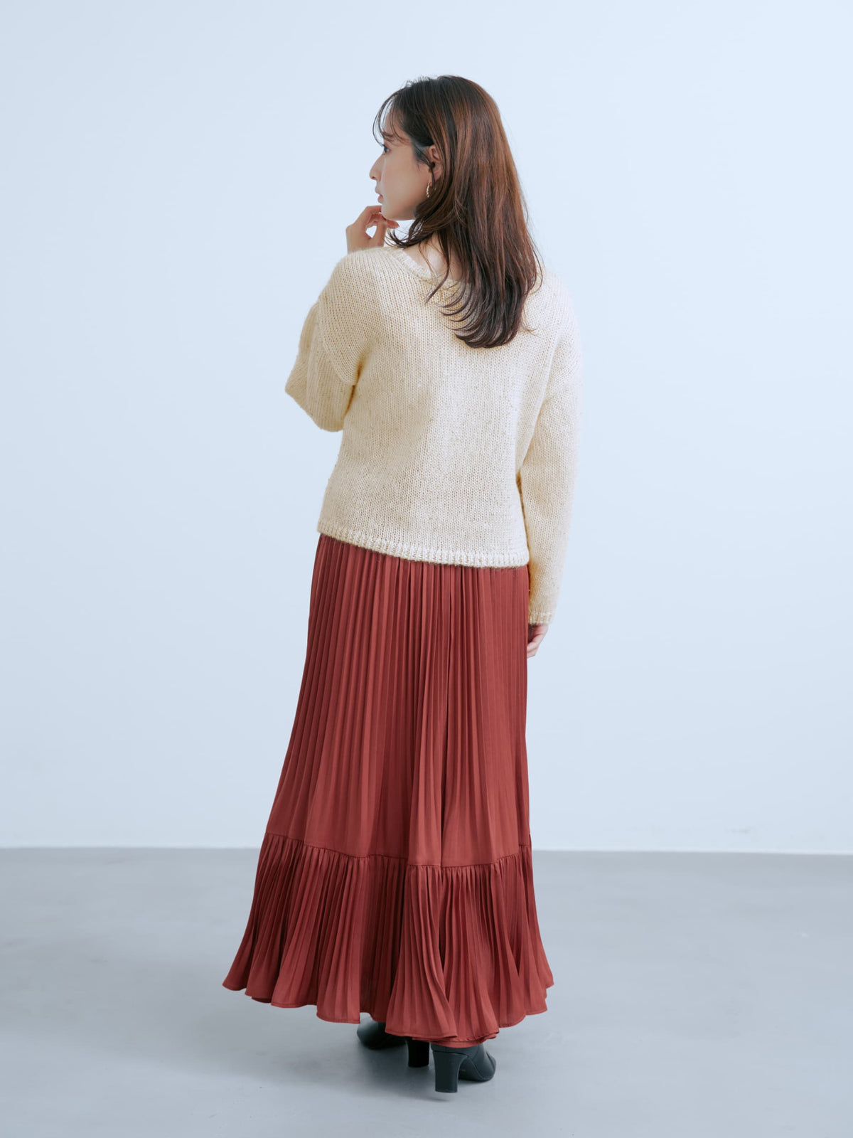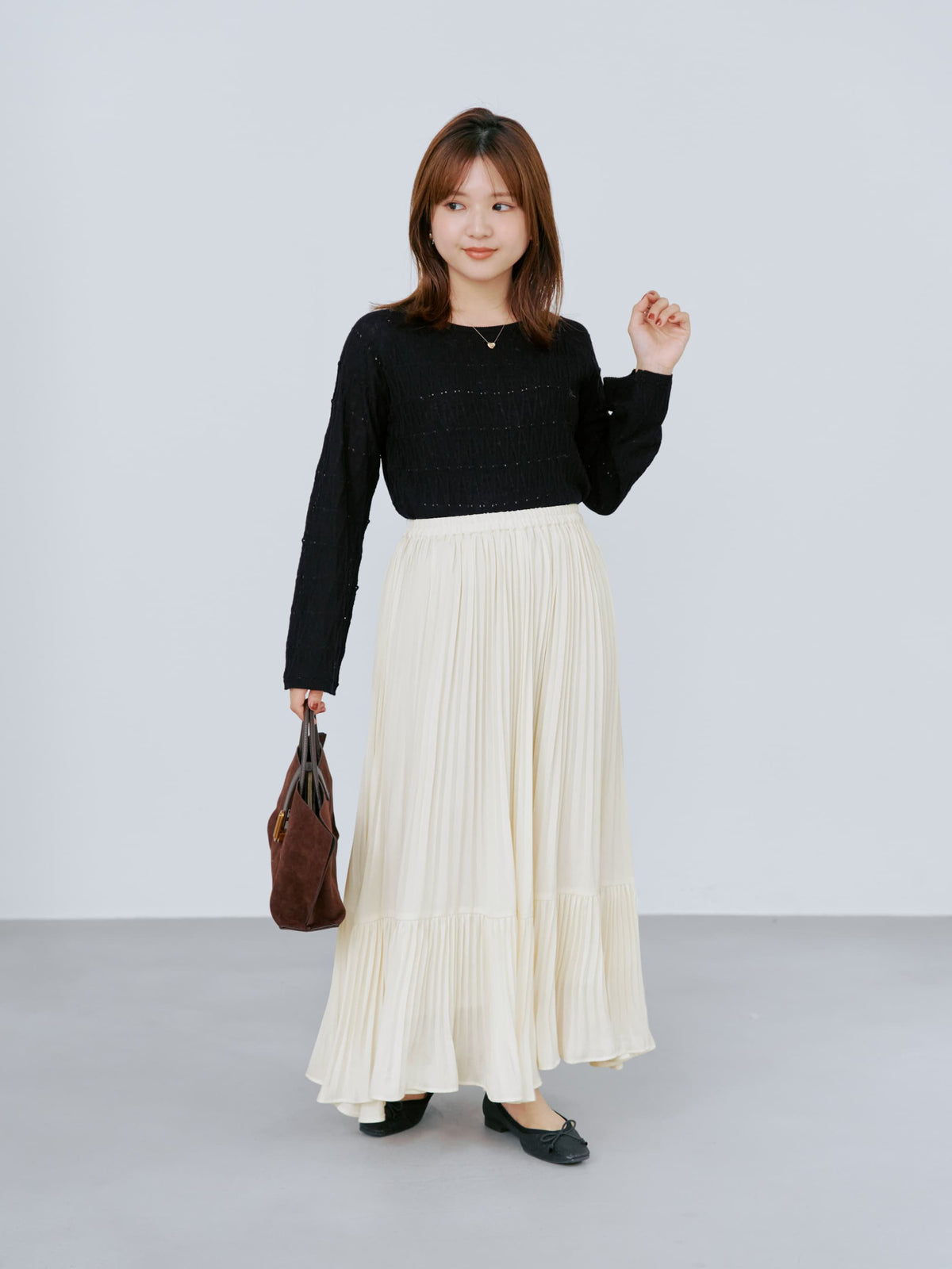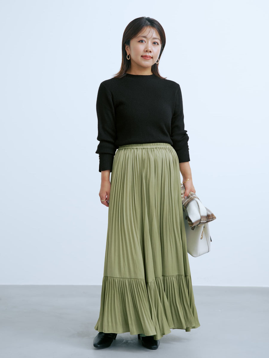 身長148cmでくるぶしまで隠れる丈感なので、フルレングスで楽しめるのも嬉しいポイントです!流れるようなプリーツシルエットのIライン効果のおかげでスタイルアップも叶います◎同系色の白ニットと合わせるもよし、鮮やかなニットとあわせて冬のカラーコーデも楽しめます! (regular着用)