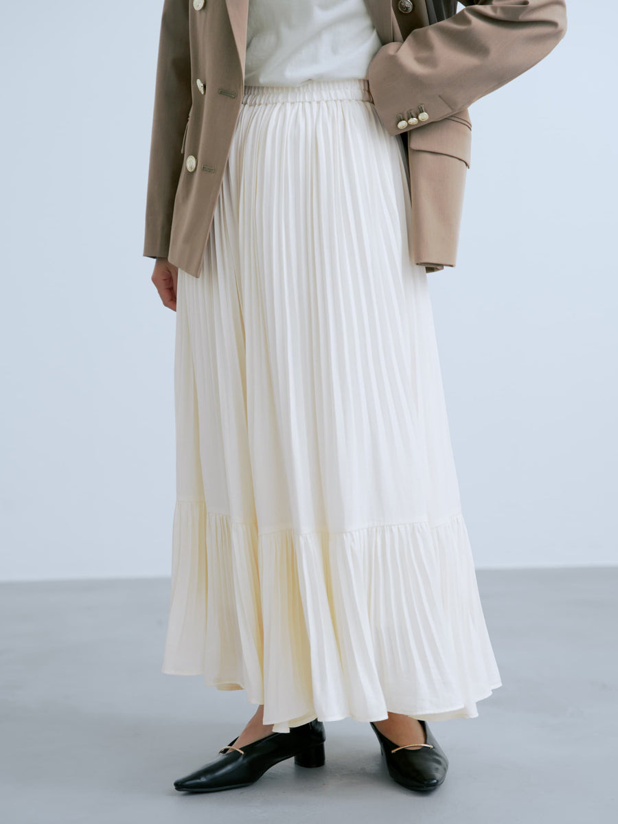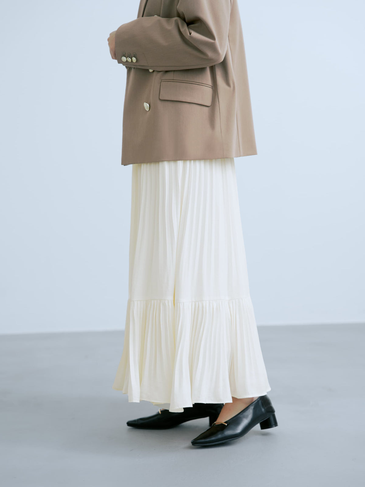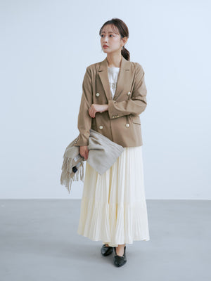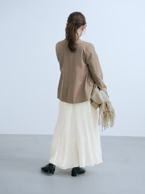アイボリーならワントーンで女っぽく、テラコッタやカーキなら一気に季節感のあるコーデに。軽やかなプリーツにジャケットを合わせると上品な大人見えコーディネートに。